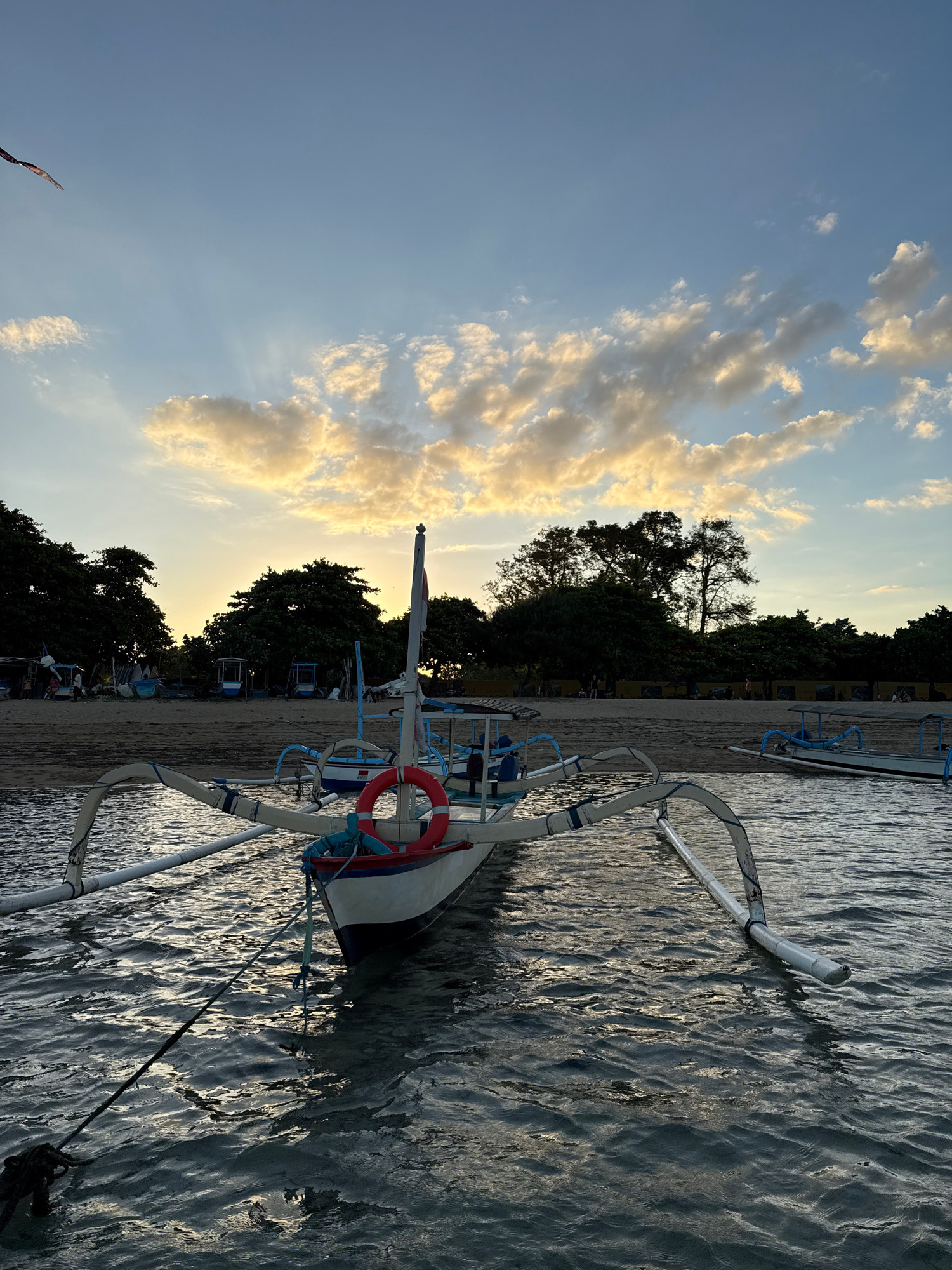 The image captures a serene scene at a beach in Denpasar, Indonesia. A traditional Indonesian outrigger boat rests on the shore, with its white hull and bamboo outriggers partially submerged in the ca…read more