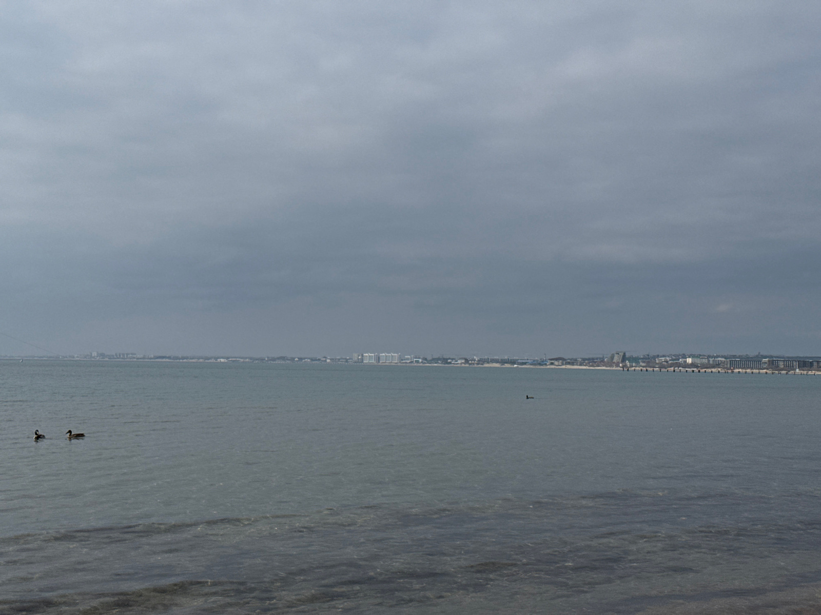 The image presents a wide, horizontal view of the Black Sea coastline in Anapa, Russia, under an overcast sky. The upper half of the frame is dominated by a uniform, light grey sky with no distinct fe…read more