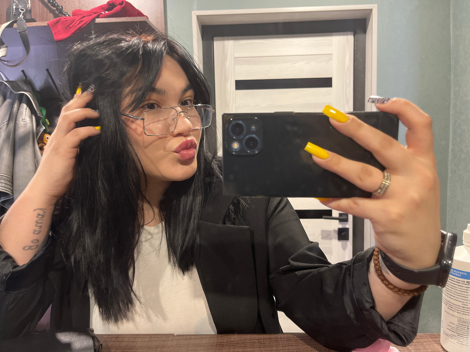 A young person, likely female, with long black hair and clear rectangular-framed glasses, captures a mirror selfie indoors in Chaikovsky, Russia. She holds a dark-colored smartphone with multiple rear…read more
