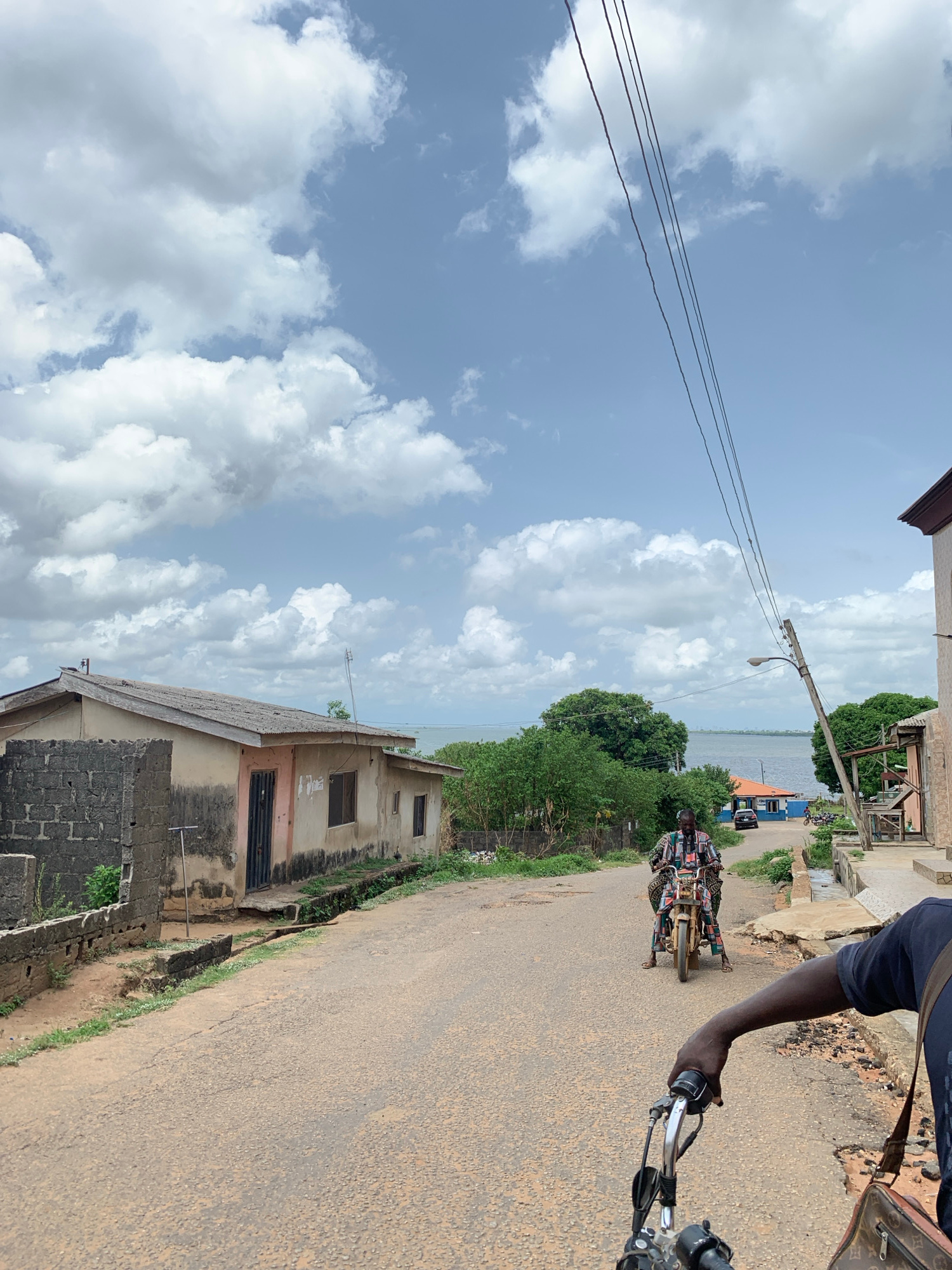 The image shows a street scene in Ikorodu, Nigeria. The view is from a moving motorcycle, with the driver's right hand visible on the throttle and handlebars. Another motorcyclist is riding in front.…read more