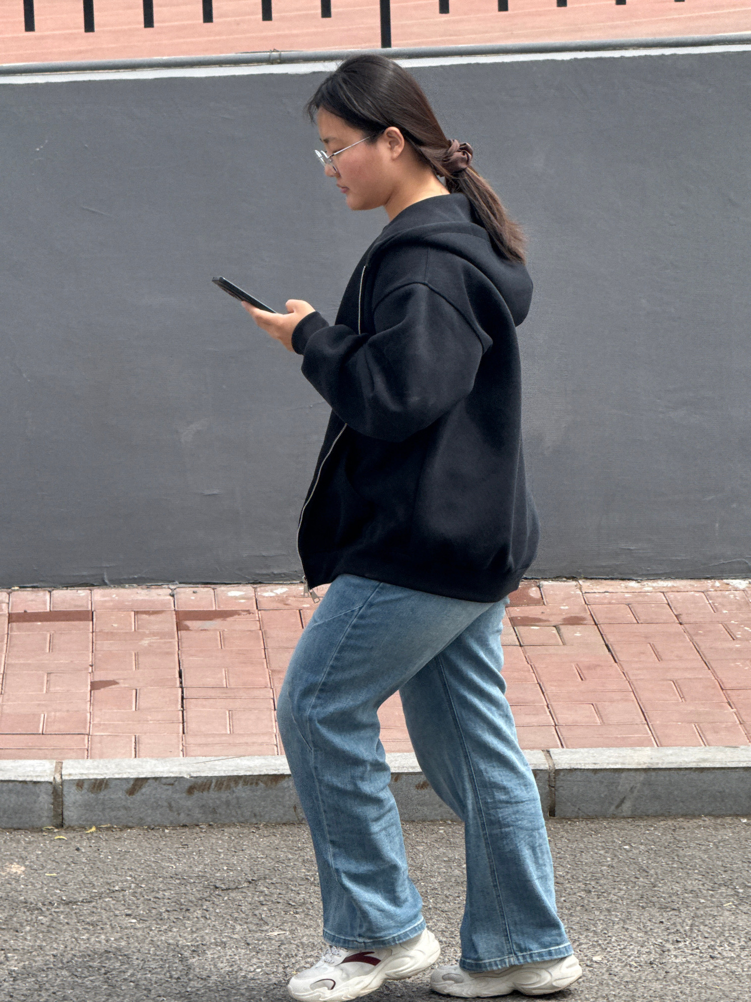 A young East Asian woman is depicted in a side profile shot, standing or walking on a paved sidewalk next to a road, in what appears to be an outdoor urban or suburban setting, possibly in Zhongtun, Cā¦read more