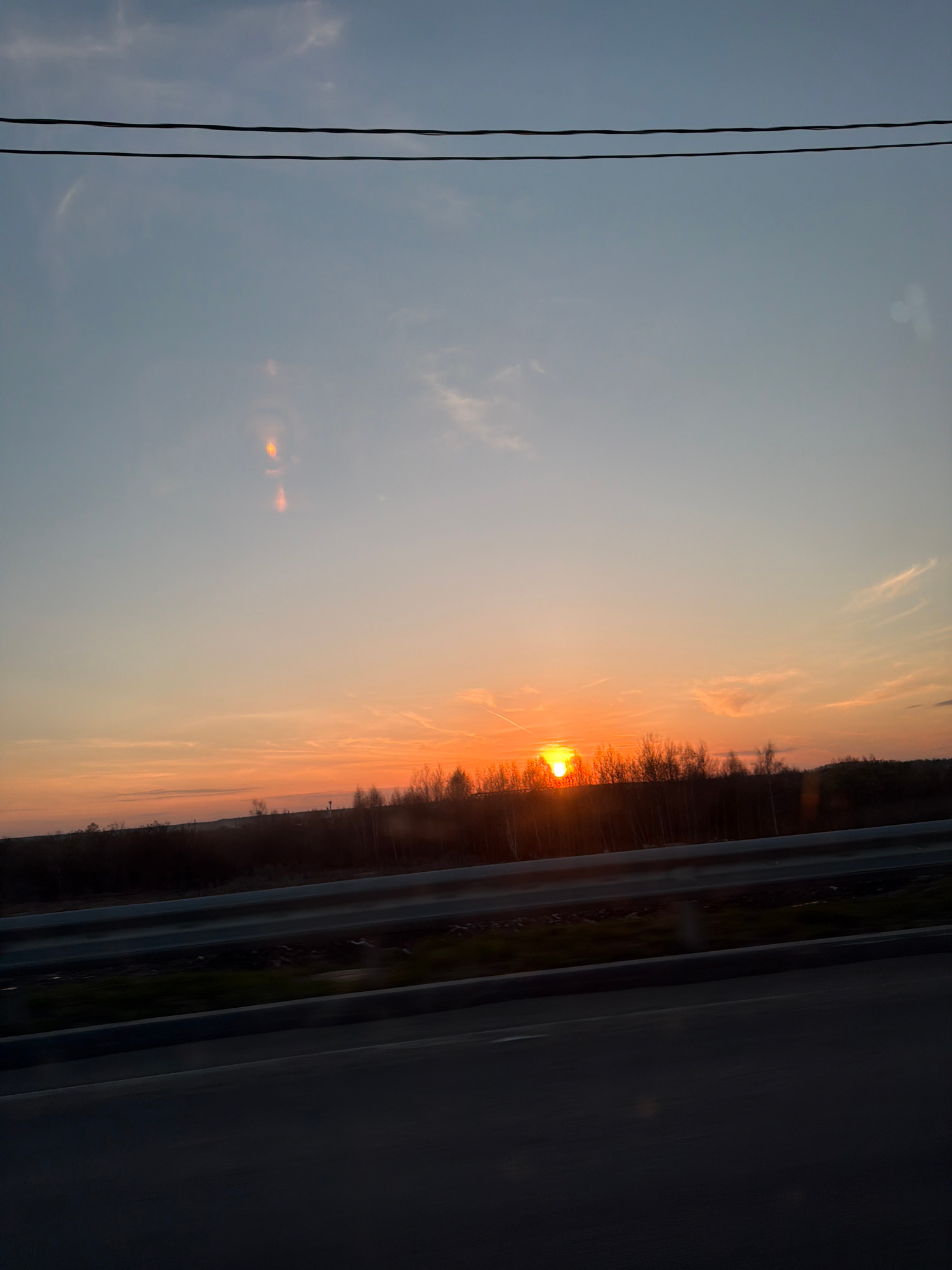 The image shows a sunset. A portion of a road is visible on the right with guardrails. In the middle of the image is a line of trees on the horizon with the sun setting behind it. A set of power lines…read more