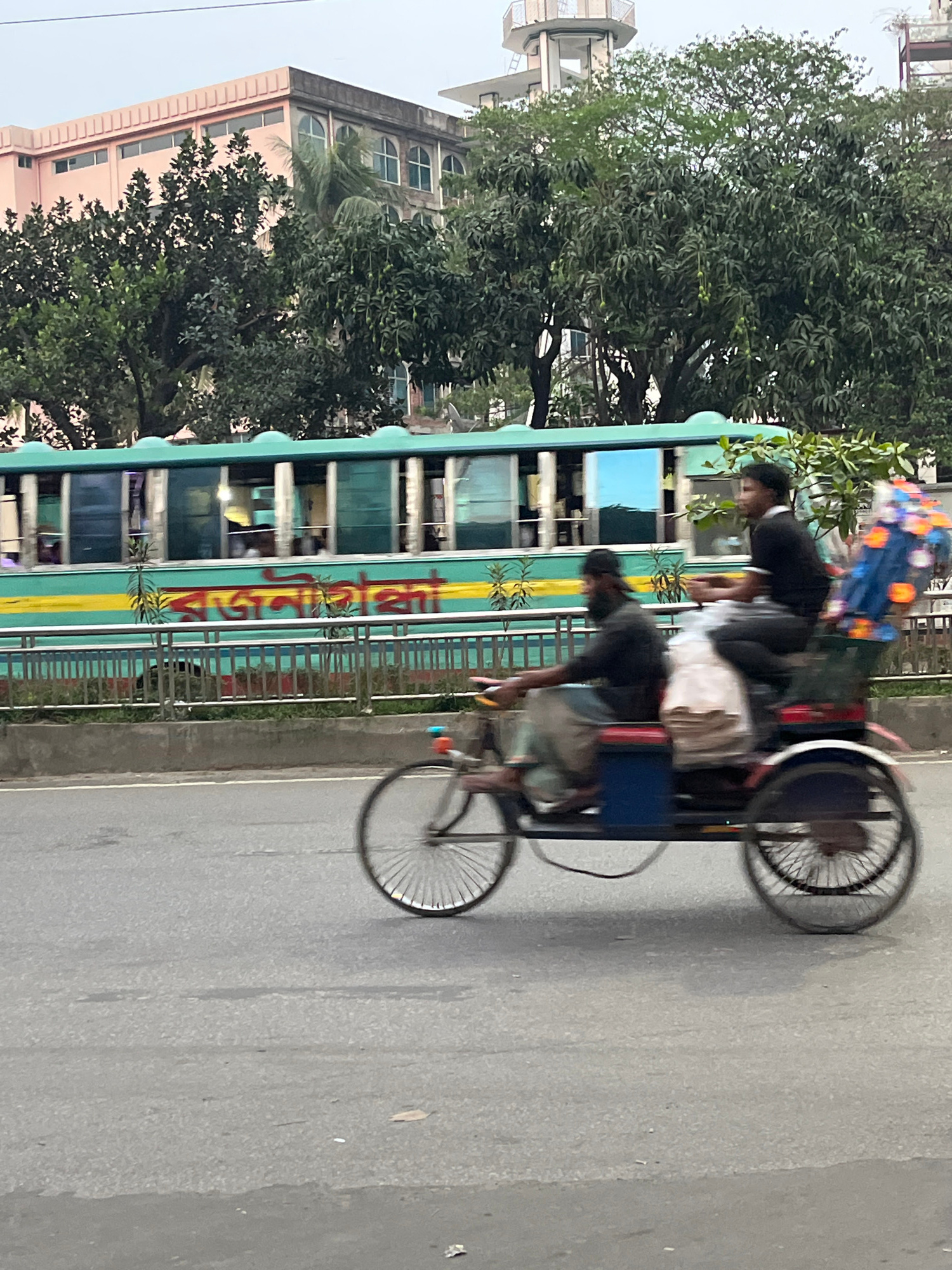 The image captures a street scene in Dhaka, Bangladesh. A cycle rickshaw, commonly used for transportation in the city, is being pedaled by a man. Another man is sitting on the passenger seat, and bot…read more