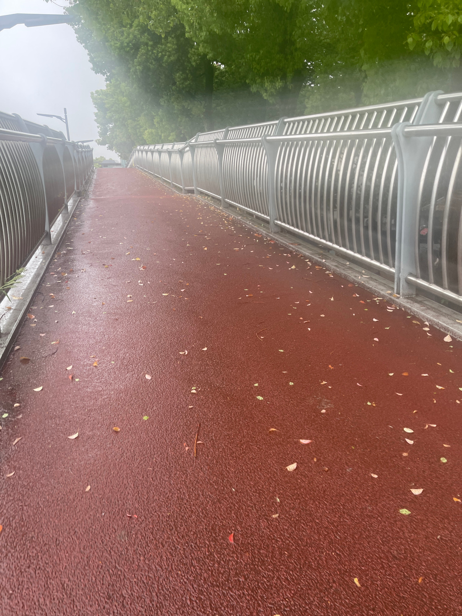 A forensic examination of the image reveals an elevated outdoor pedestrian pathway located in the Chongqing High-tech Zone, China. The path, constructed with a reddish-brown, textured, possibly rubber…read more