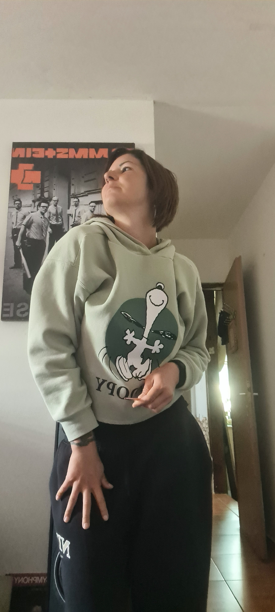 A person is pictured indoors, wearing a light green sweatshirt with a Snoopy graphic and black pants. The person is holding a thin stick or rod near the front of the sweatshirt. Behind the person is a…read more
