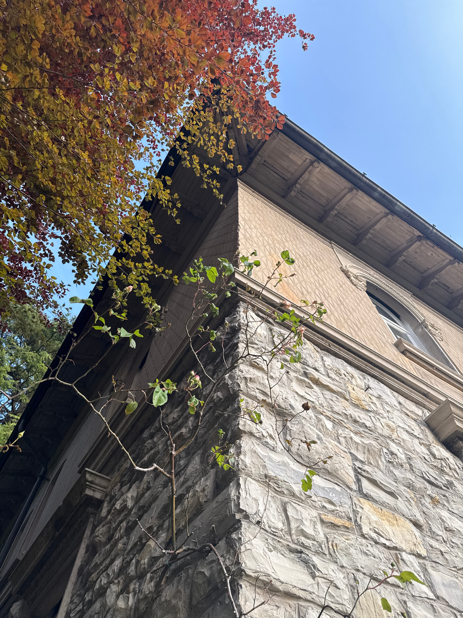 View looking up at a multi-story building in Erba, Italy. The building has a stone facade on the right and a lighter colored stucco facade on the left with a round window. Vines grow down from the bui…read more
