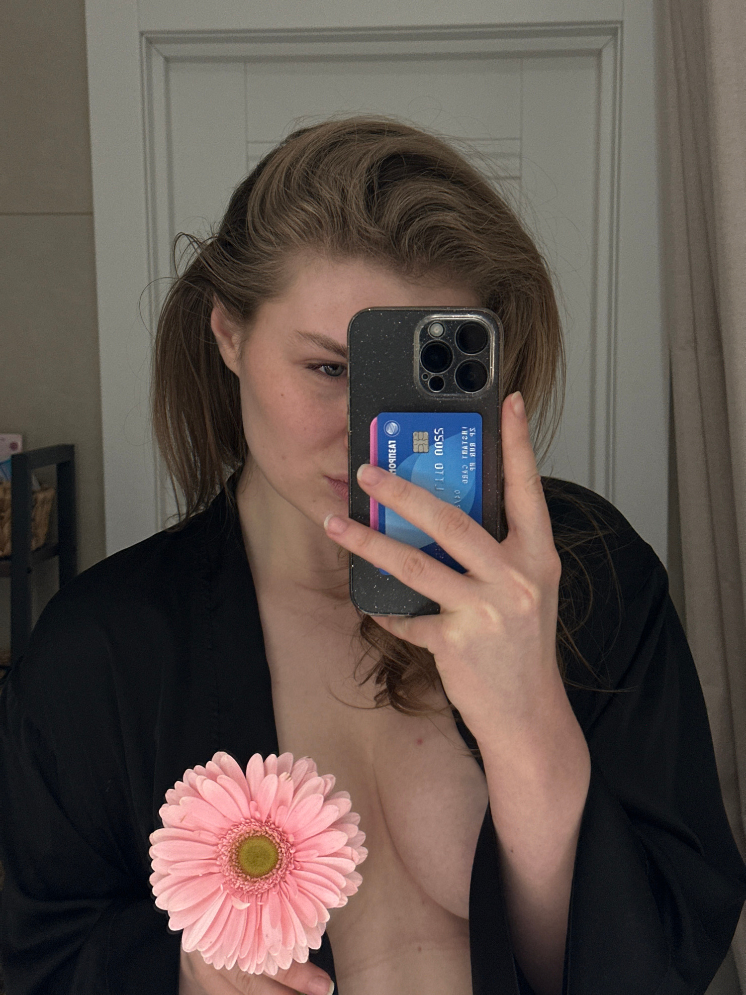 The scene depicts a female individual taking a mirror selfie indoors in Kazan, Russia. The subject has light brown hair and is partially visible, showing her left eye, nose, cheek, and chin, looking t…read more