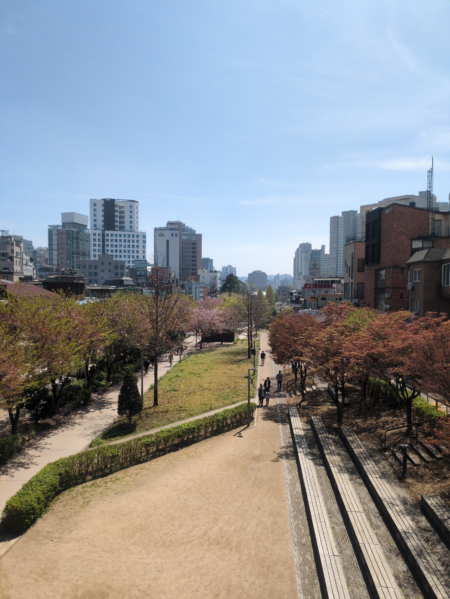 This image depicts a park scene in Seoul, South Korea, viewed from an elevated position, likely a building. On the left, there is a clear blue sky above the city. A mixture of buildings, from low-rise…read more