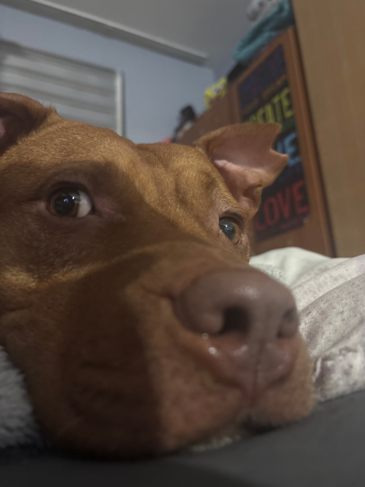 A very close-up, low-angle shot captures the face of a reddish-brown, short-haired dog indoors in Sofia, Bulgaria. The dog's head is tilted slightly, with its large, dark eyes gazing directly and curiβ¦read more