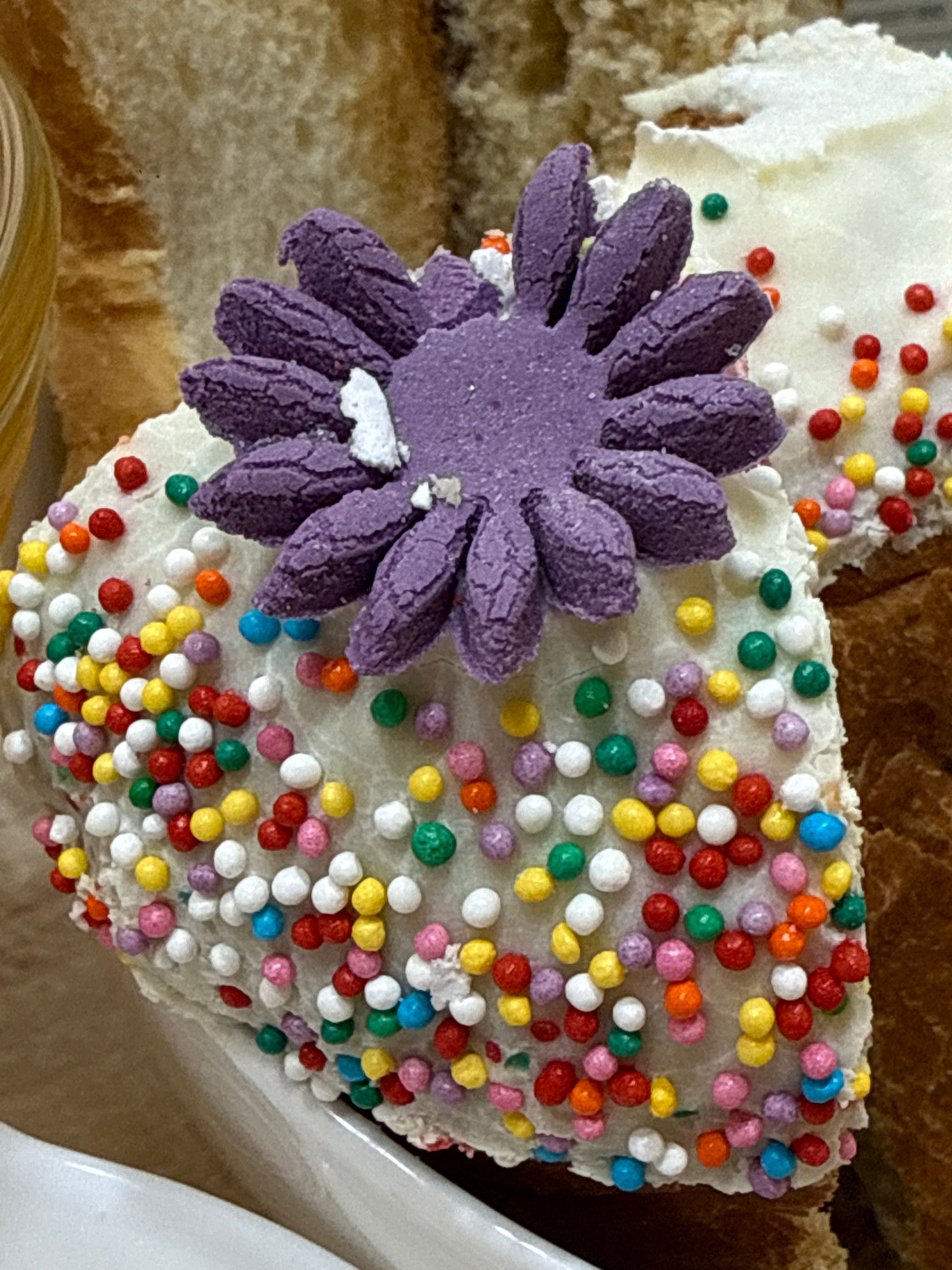 A close-up shot depicts a decorated cupcake with white frosting. Multi-colored sprinkles cover the frosting, and a large purple flower adorns the cupcake's side. Sections of other baked goods are visi…read more