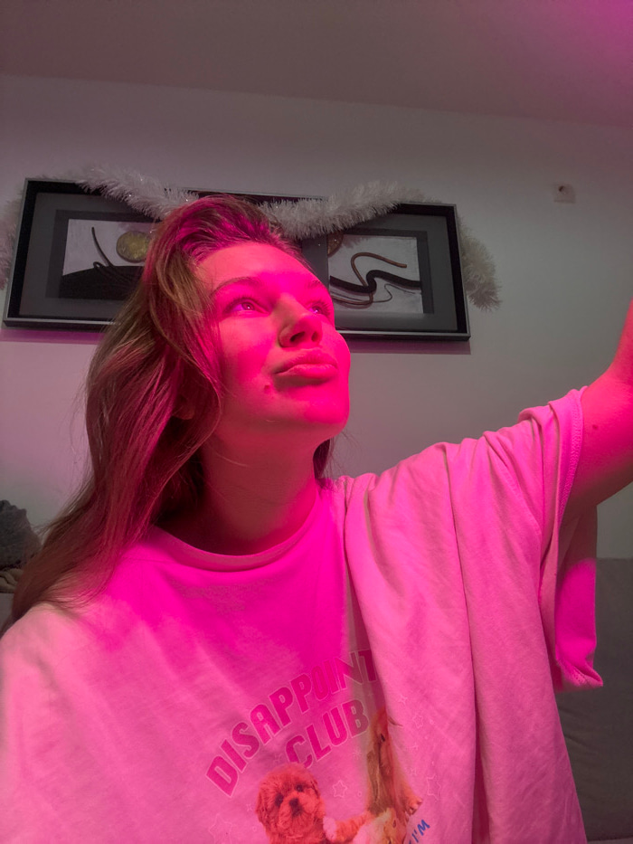 A young woman with fair skin and light brown hair is illuminated by a pink light. She wears a light-colored shirt featuring the words "DISAPPOINT CLUB" and a cartoon graphic. Behind her, a framed piec…read more