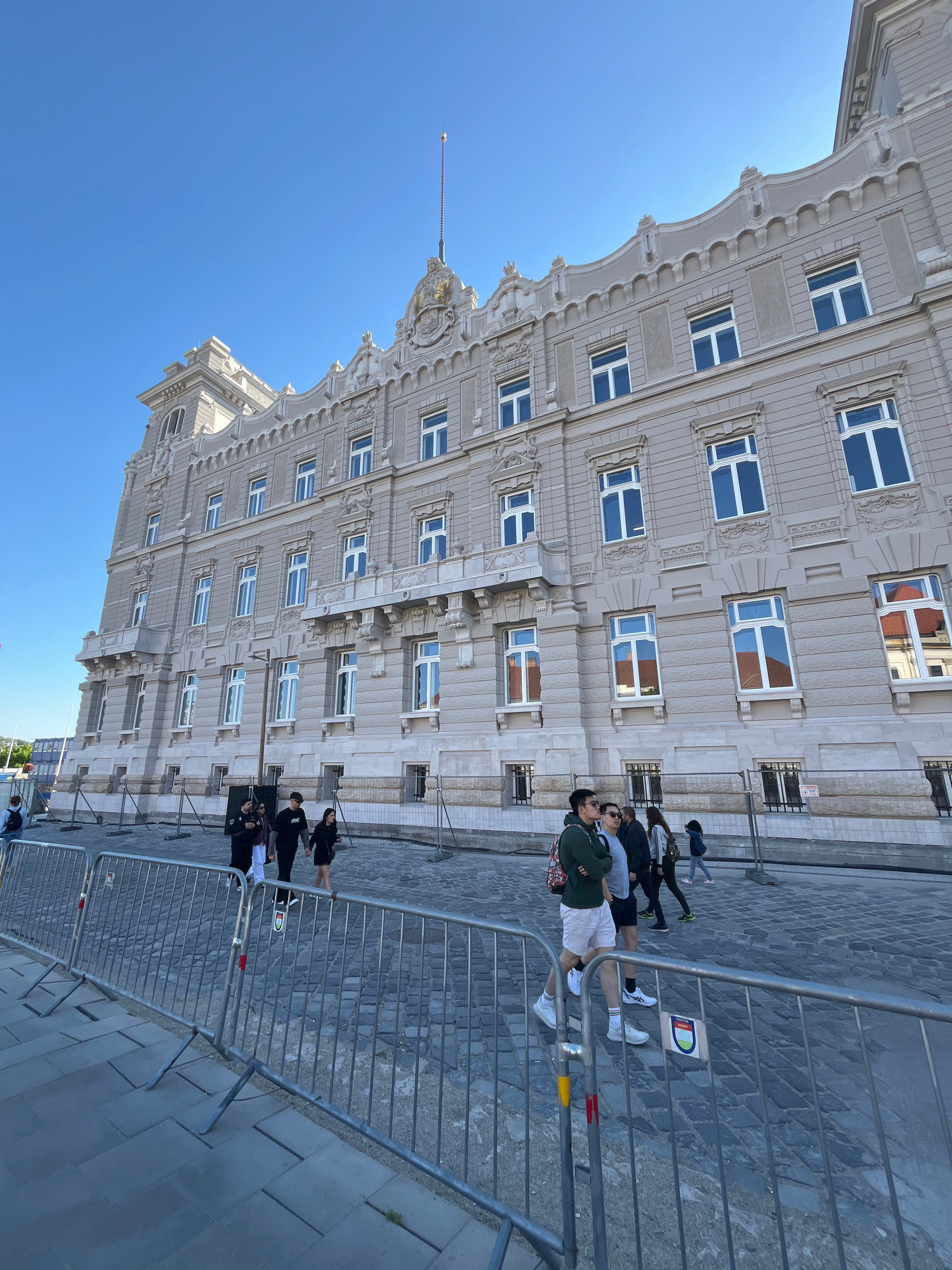 The image shows a tall, ornate building with many windows under a clear blue sky. The building has a light-colored facade with detailed architectural features. A metal fence runs along the bottom of t…read more