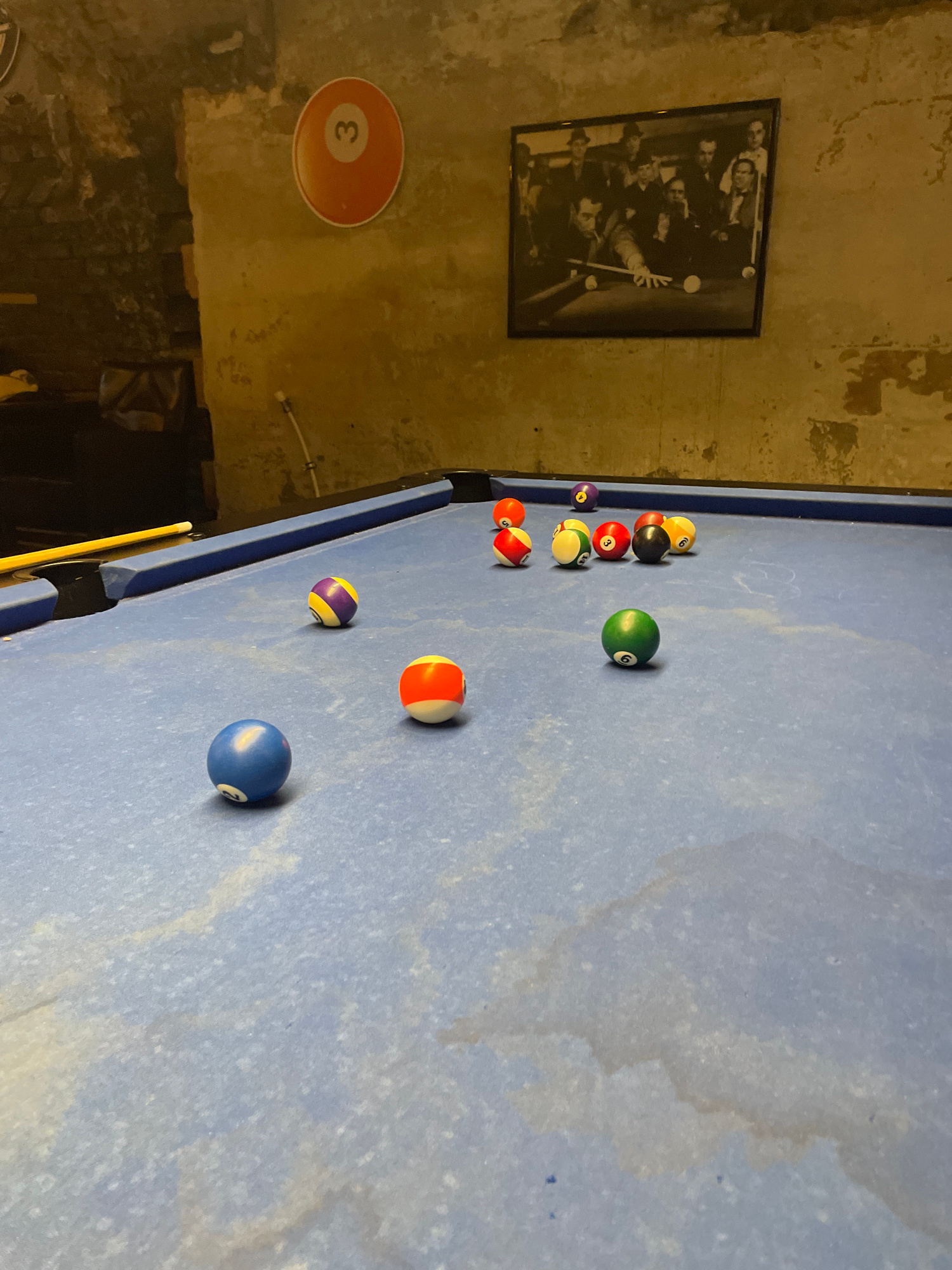 The image shows a billiard table with several billiard balls on it. The balls are of various colors and numbers. A cue stick is visible near the edge of the table. The table has a blue felt surface. T…read more