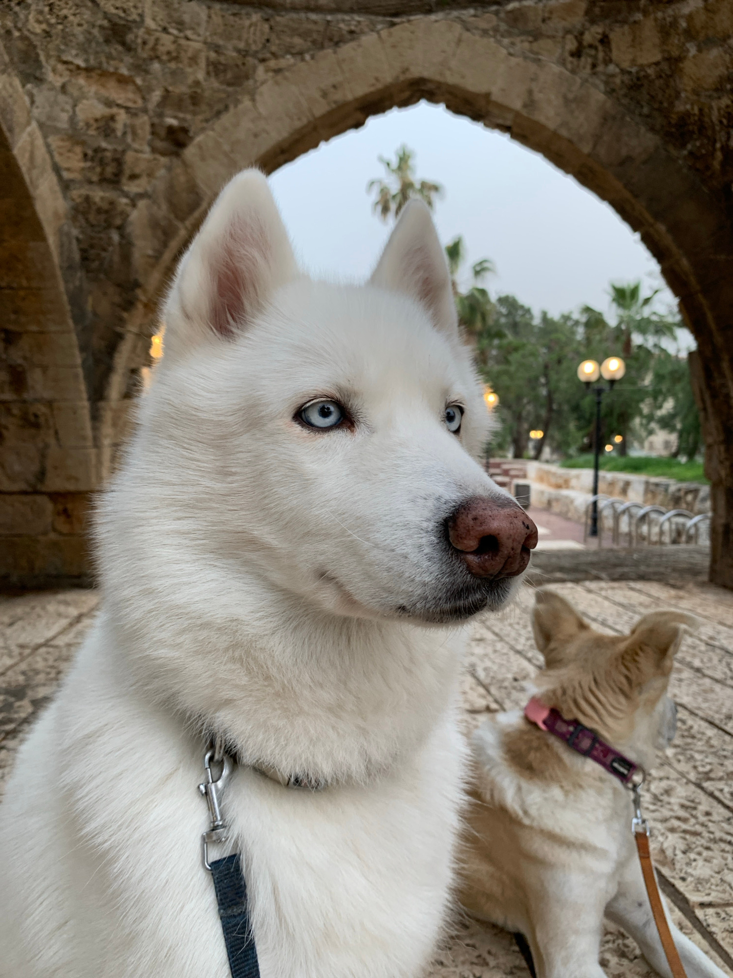 A close-up, eye-level shot depicts a white dog with striking blue eyes gazing upwards. The dog is wearing a black collar with a silver clasp. In the background, blurred and partially obscured, lies an…read more