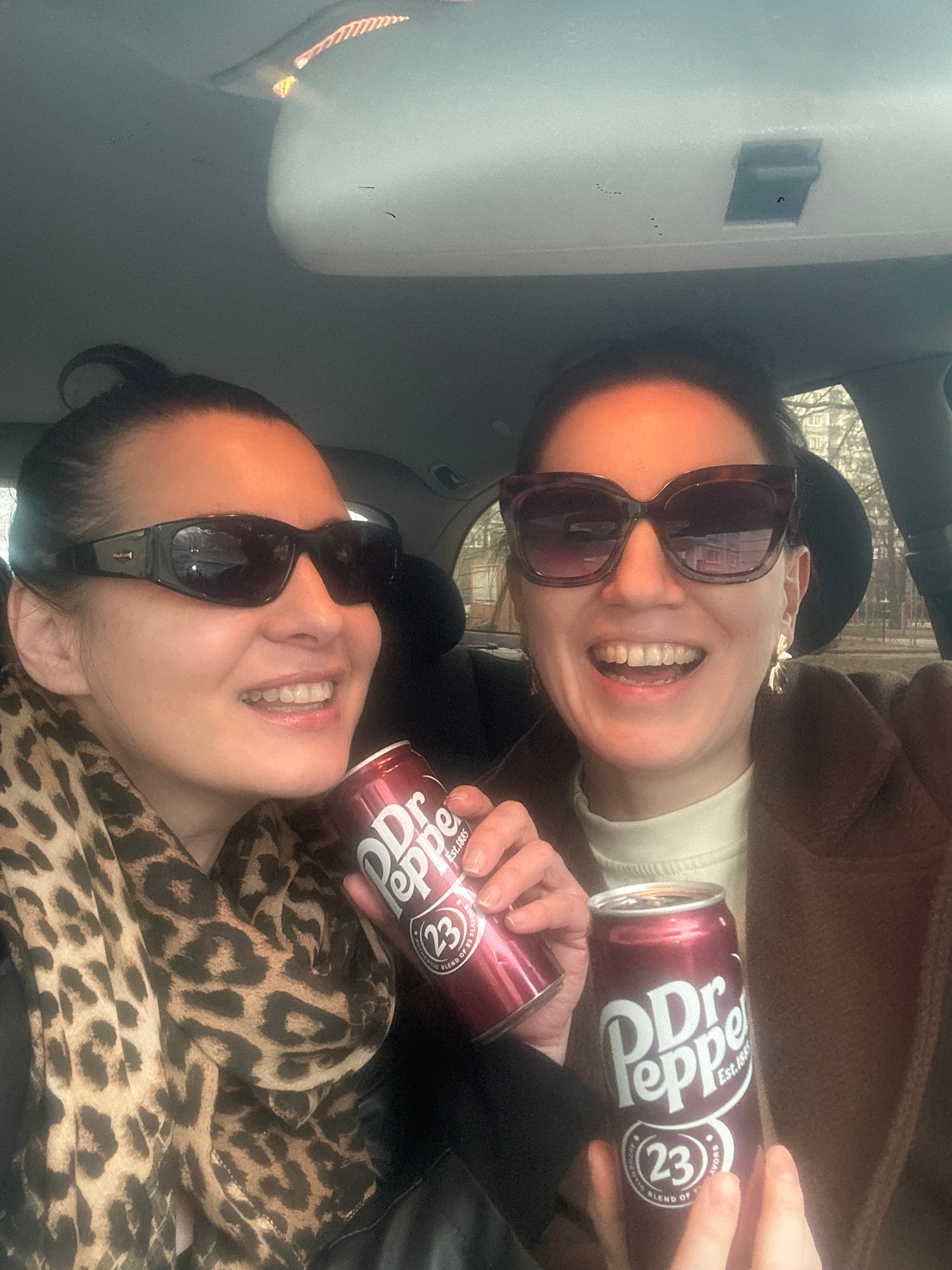 Two women are posing for a photo inside a car, holding cans of Dr Pepper. The woman in the foreground is wearing sunglasses and a leopard-print scarf. The woman in the background is also wearing sunglβ¦read more