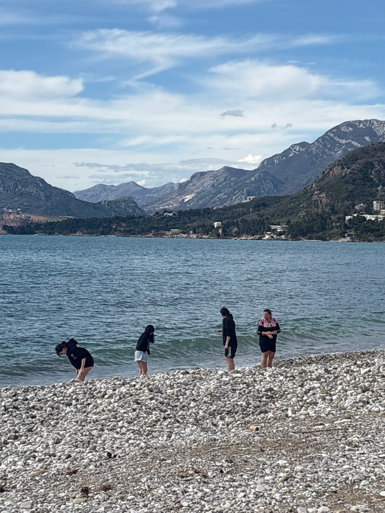 Four people are standing in the shallow water on a pebble beach. Behind them is the Adriatic Sea and a mountain range. Buildings can be seen on the lower slopes of the mountain. The sky is blue with s…read more