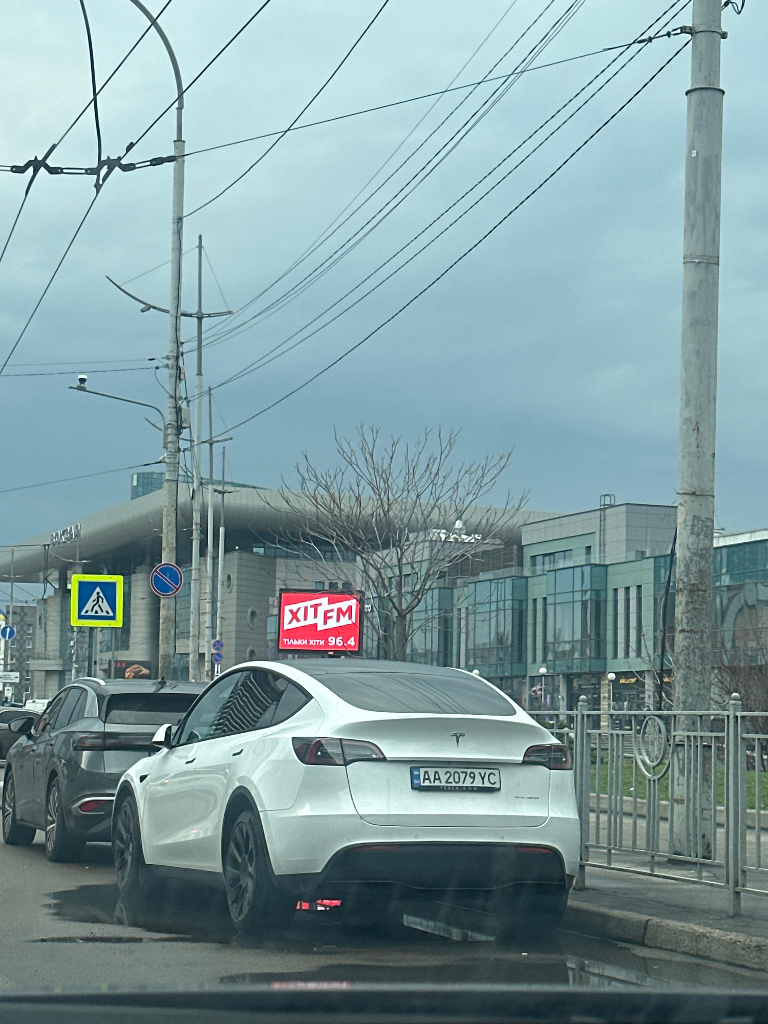 The image captures a street scene in Kyiv, Ukraine, on an overcast day. A white Tesla with the license plate "AA 2079 YC" is prominently featured, stopped in traffic. In the background, street signs,…read more