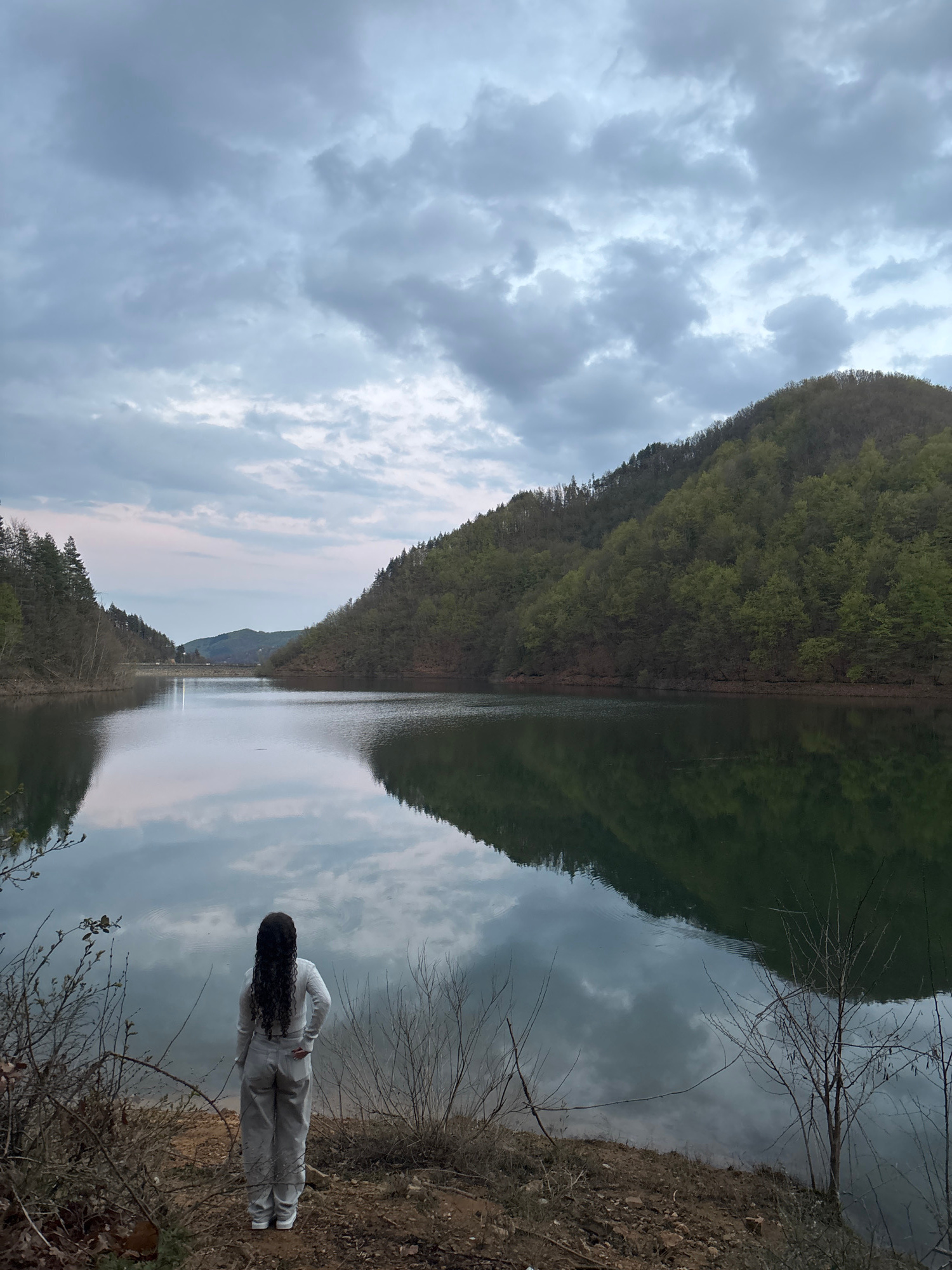The image depicts a reflective body of water, likely a lake or reservoir, framed by hills densely covered with green trees. The sky is overcast with gray clouds. A woman stands on the shoreline, facin…read more
