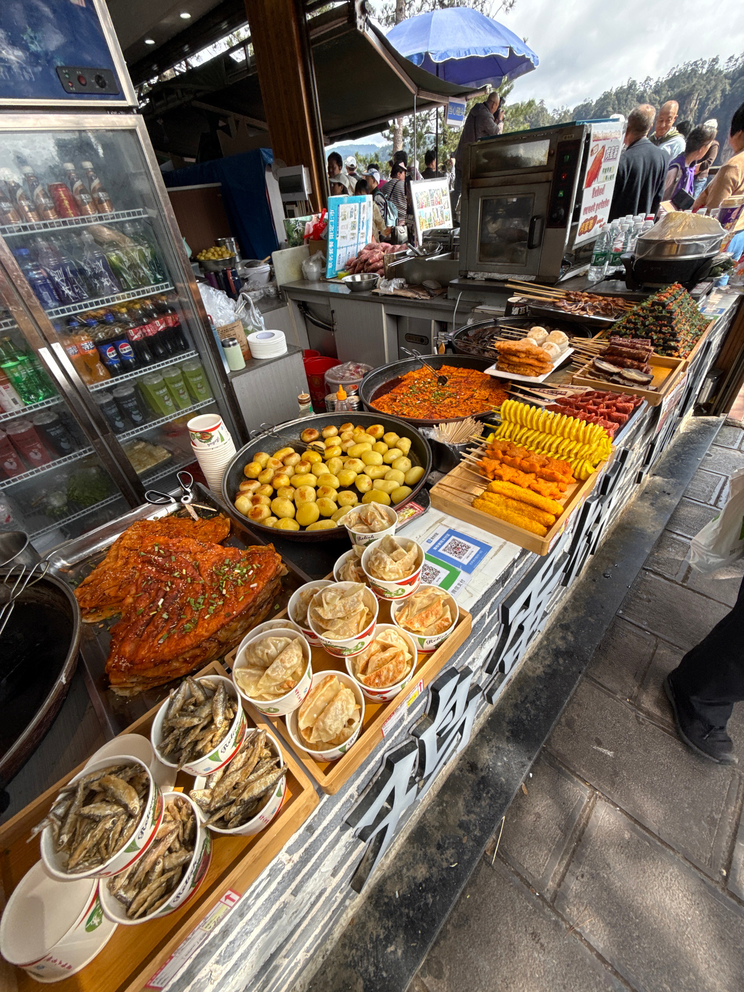 The image depicts a street food stall in Luoguta, China. The stall showcases a variety of Chinese street foods, including skewers of various meats and vegetables, fried potatoes, fried fish, dumplings…read more