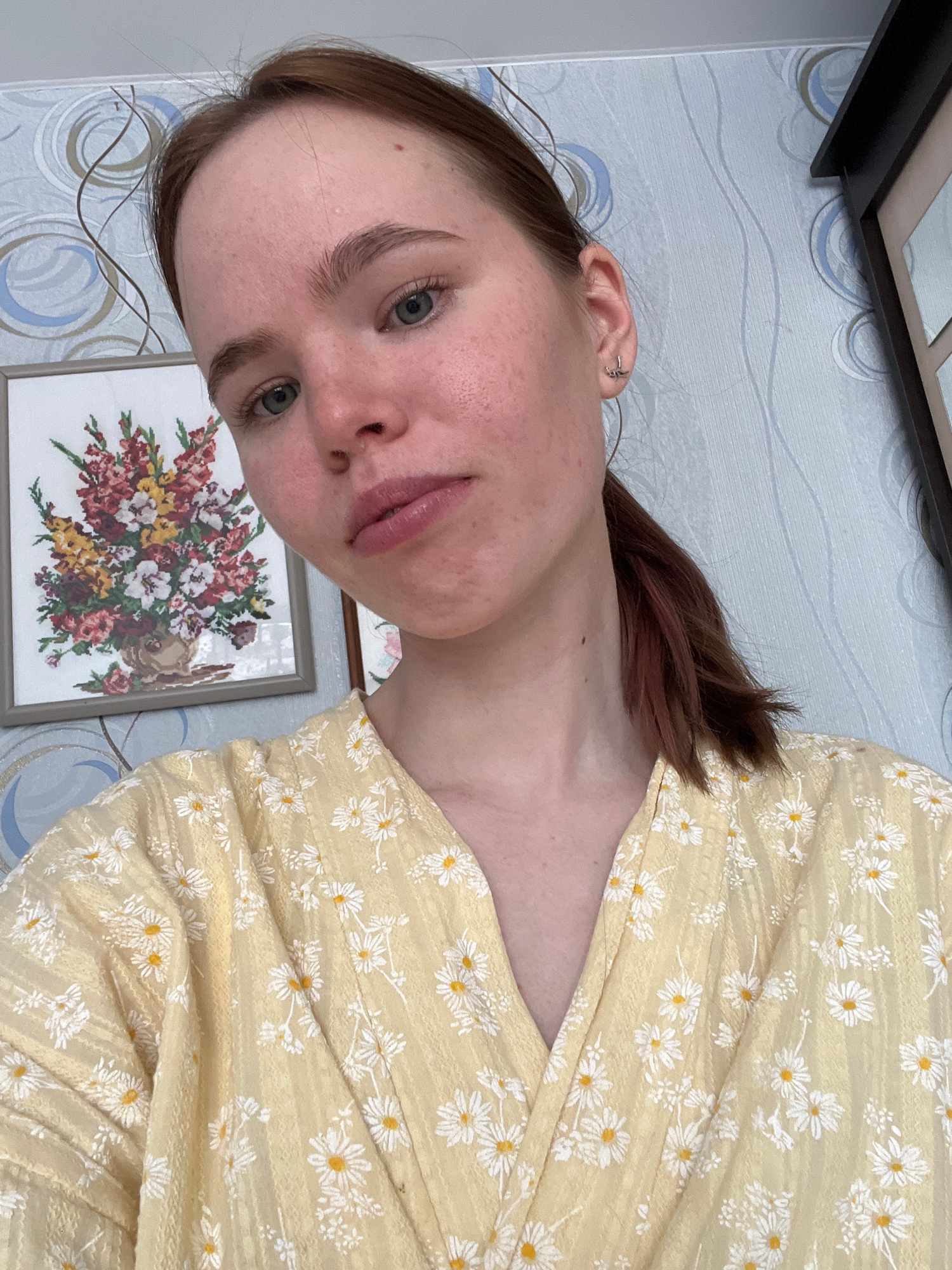 A young woman with auburn hair pulled back into a ponytail is shown in a close-up indoor photograph. She has fair skin, blue eyes, and full lips. She is wearing a light yellow dress with a white flora…read more