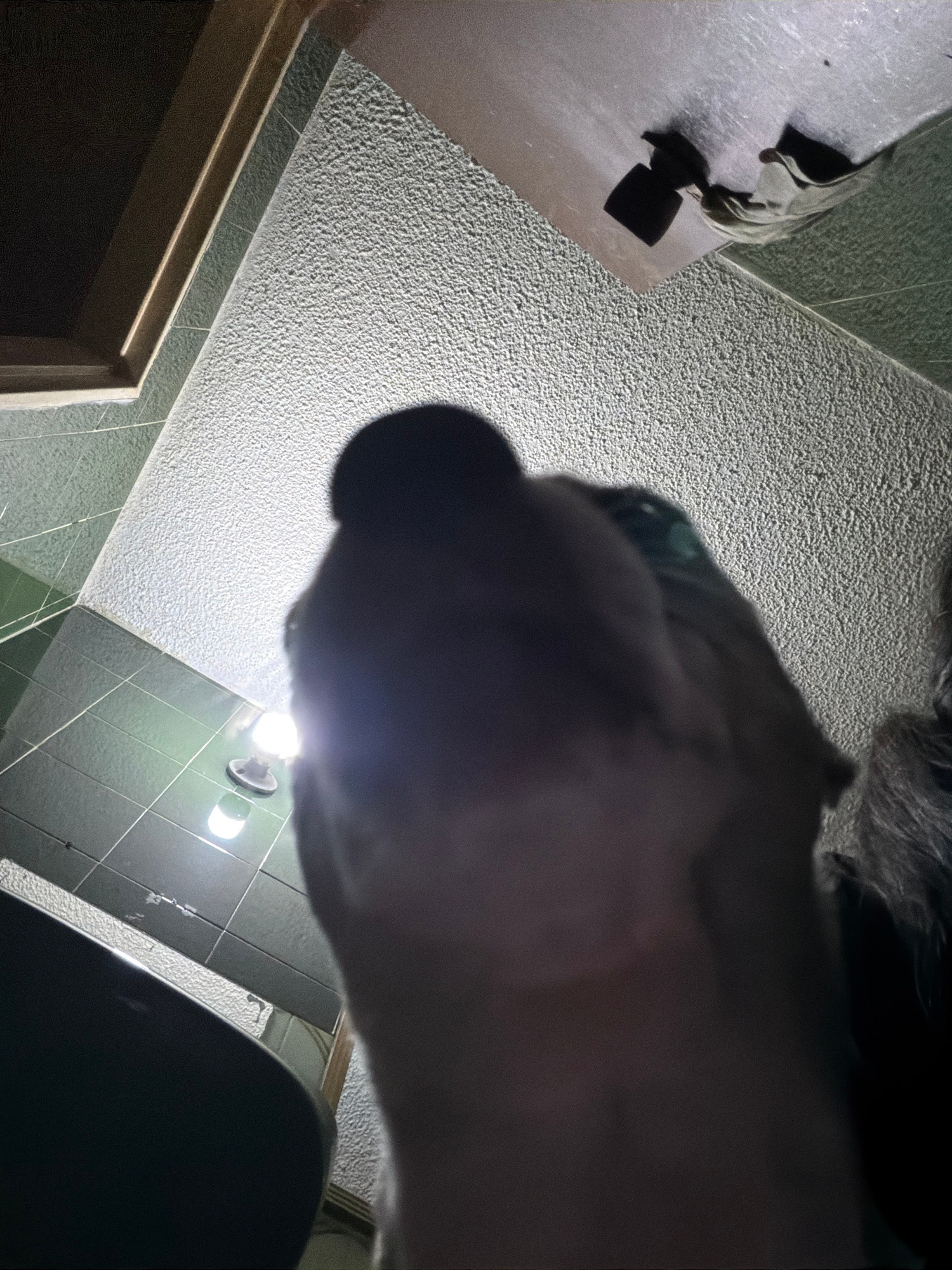 The scene is an upward-angled view of a bathroom. A dog's snout, with a prominent black nose, dominates the foreground. A ceiling with a textured surface is visible above. Below, there are green tiles…read more