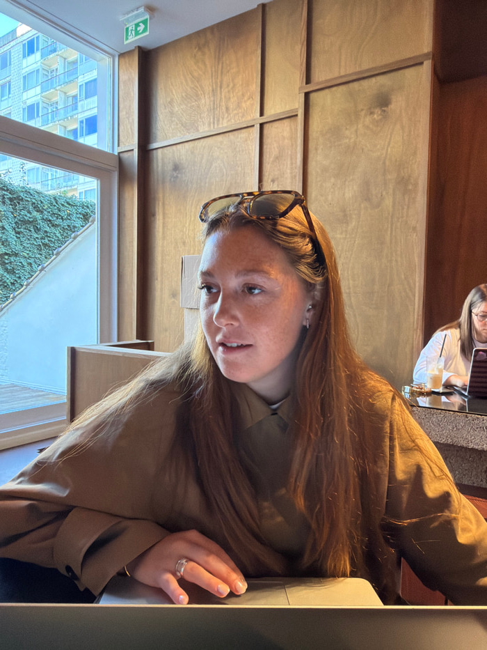 The image depicts an indoor scene, likely a cafe or co-working space, located in Brussels, Belgium. In the foreground, a young adult female with long auburn hair, freckles, and small hoop earrings is…read more