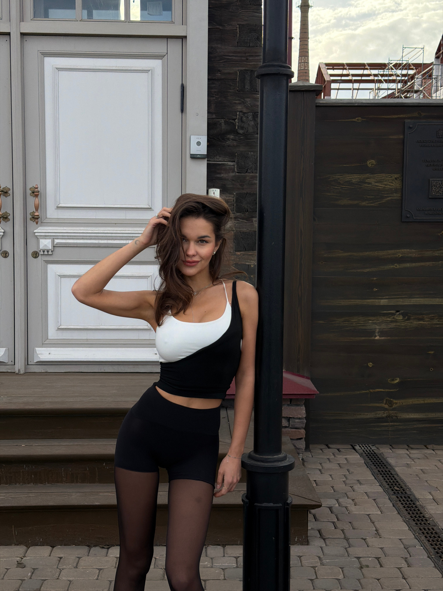 A full-length medium shot captures a woman in Krasnoyarsk, Russia. She stands in front of a light-gray door set into a wall made of weathered dark wood and gray brick. The location is defined by disti…read more