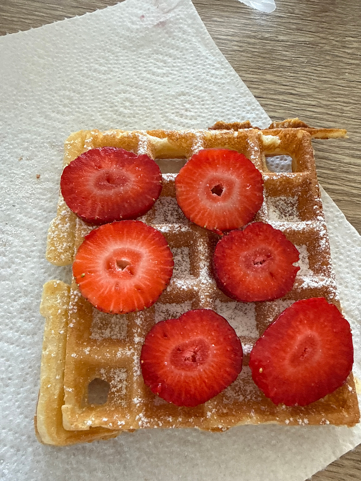 The image shows a waffle topped with sliced strawberries and dusted with powdered sugar. The waffle is positioned on a white paper napkin. The background appears to be a wooden surface, possibly a tab…read more