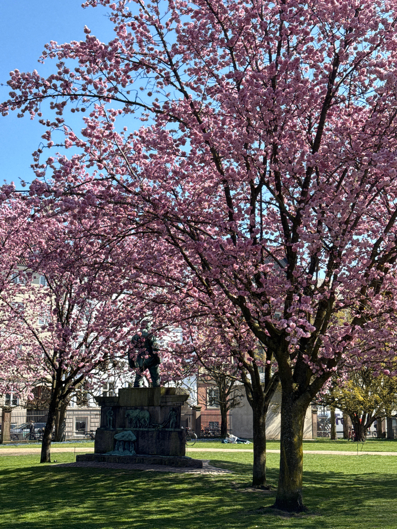 This image captures a vibrant spring scene in a park, likely in Copenhagen, Denmark, as indicated by the context. The photograph, originally taken in a vertical (portrait) orientation, appears rotated…read more
