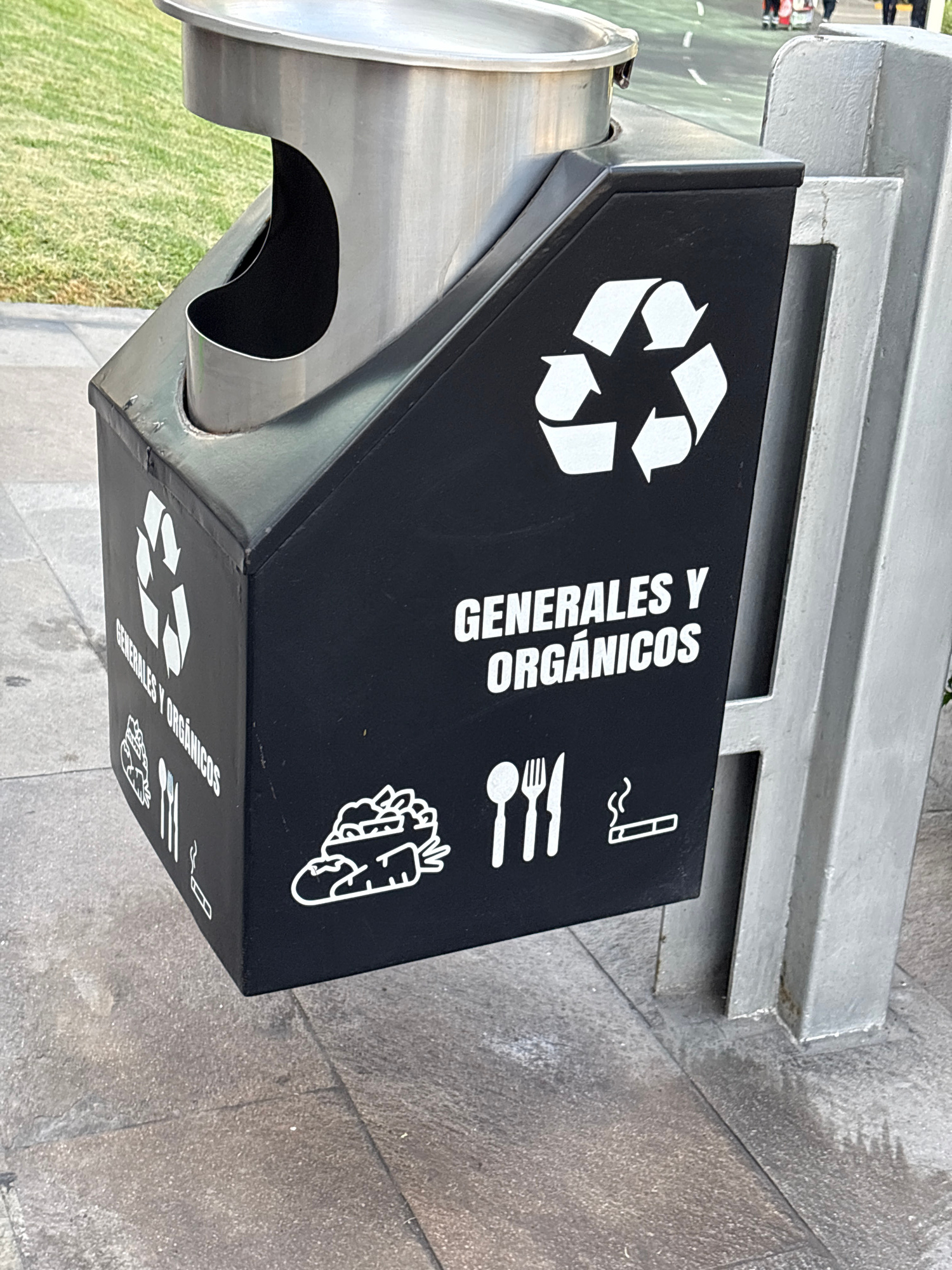 The image shows a metal public trash can in the city of San Isidro, Peru. The trash can has a black lid with white markings. The markings include the universal recycling symbol, the Spanish text "GENE…read more