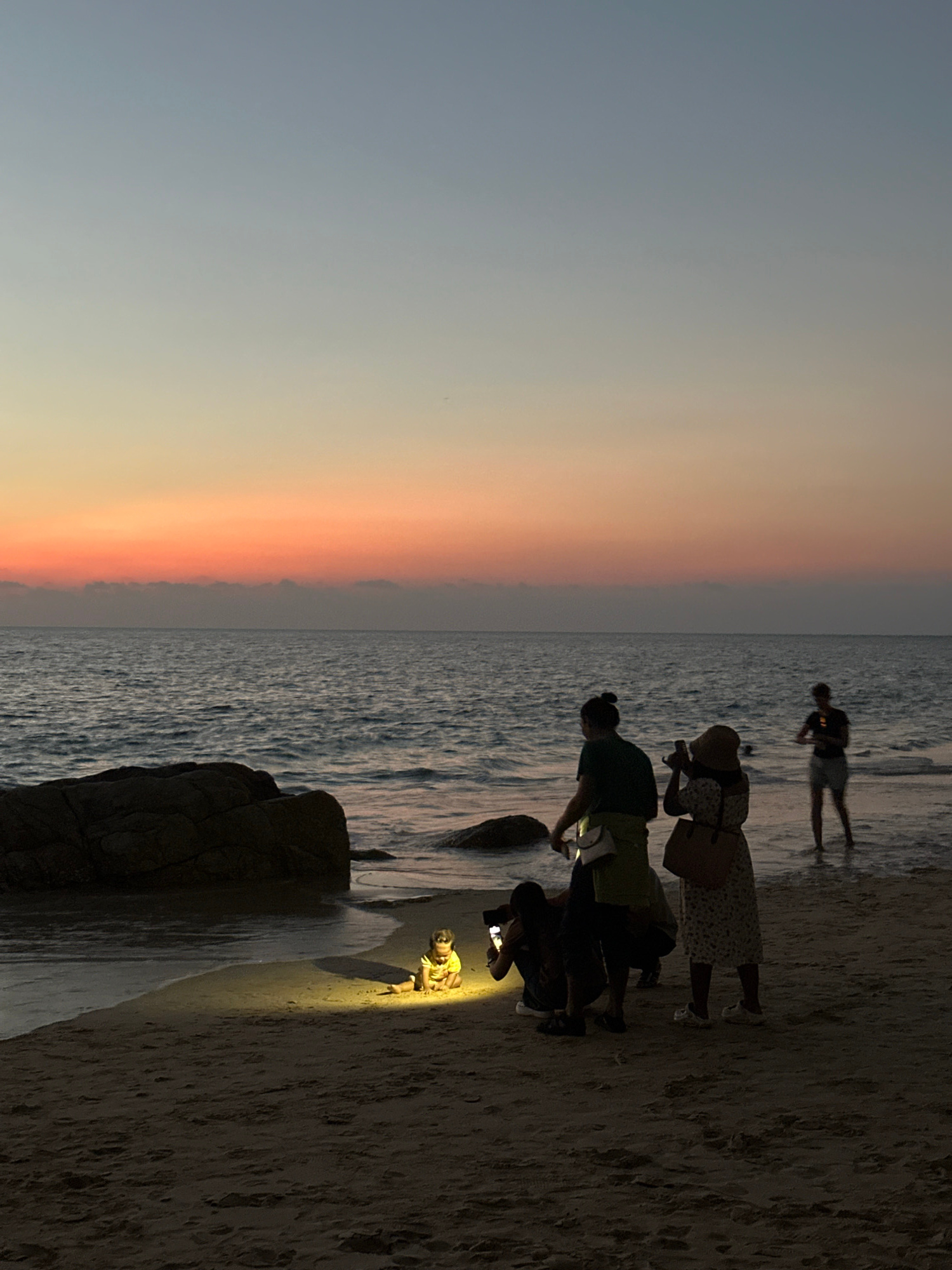 At a beach in Sakhu, Thailand, the scene unfolds at dusk, as suggested by the gradient of light transitioning from a pale blue-gray to shades of orange near the horizon. The sea is a dark gray with subtle ripple patterns, likely reflecting the fading light. A large, dark rock formation is present at the edge of the sea. Five individuals are present on the sandy beach, their forms silhouetted against the remaining light. From top to bottom: - One person is walking along the beach. - Another individual, possibly a woman, is taking a picture with a camera or phone. - Another individual appears to be taking picture of the small child with the yellow light. - A person is using a flashlight to illuminate a small child near the shoreline. The child is also illuminated by a handheld flashlight. The texture of the sand varies, appearing smoother near the water and coarser towards the edge of the frame. | Open Wire