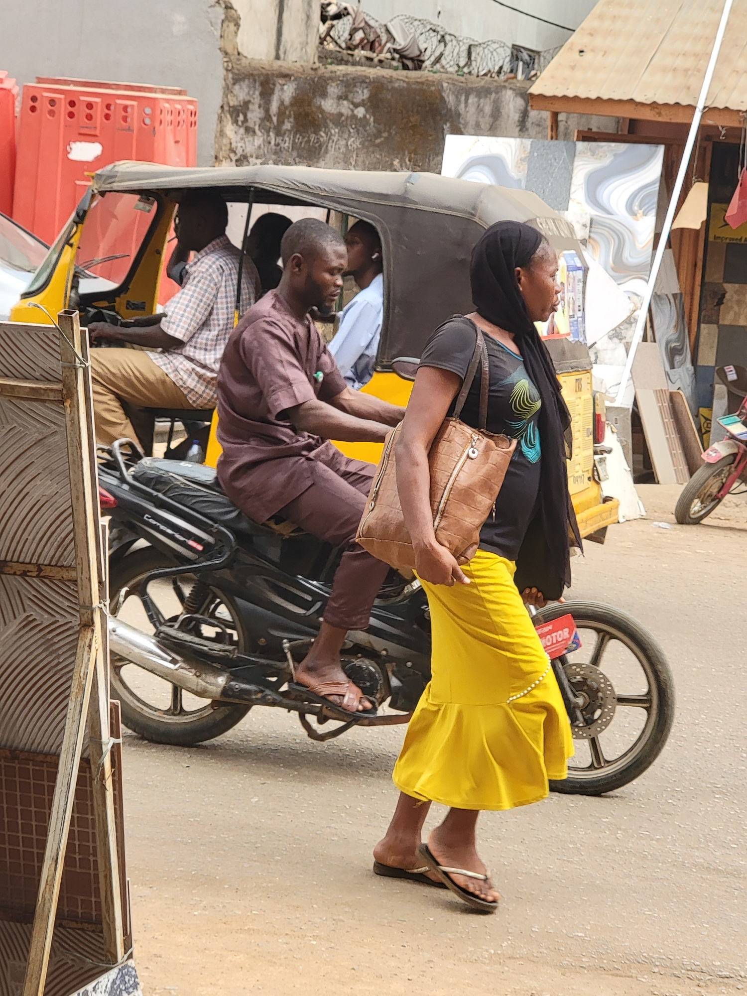 The image depicts a scene in Maiburiji, Nigeria. A woman wearing a black headscarf, a grey shirt, and a yellow skirt is seated behind a male passenger on a motorcycle taxi. The male passenger is weari…read more