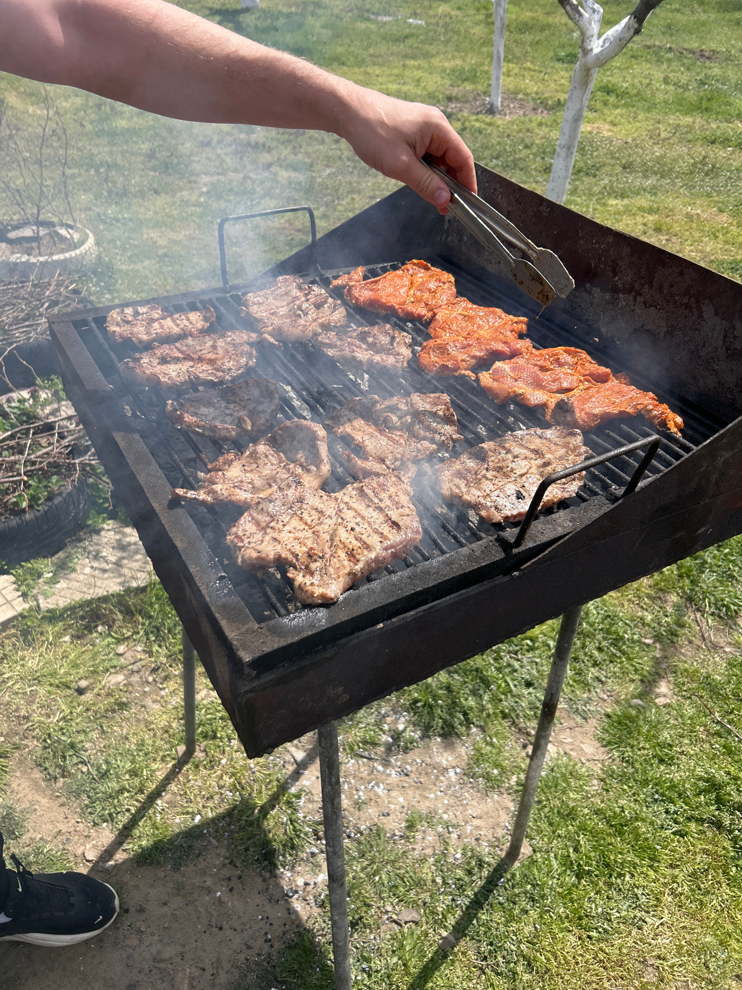 An overhead, medium shot shows a person grilling meat on a charcoal grill in an outdoor setting, possibly in Sopot, Bulgaria. The grill is loaded with various pieces of meat, some appearing more marinβ¦read more