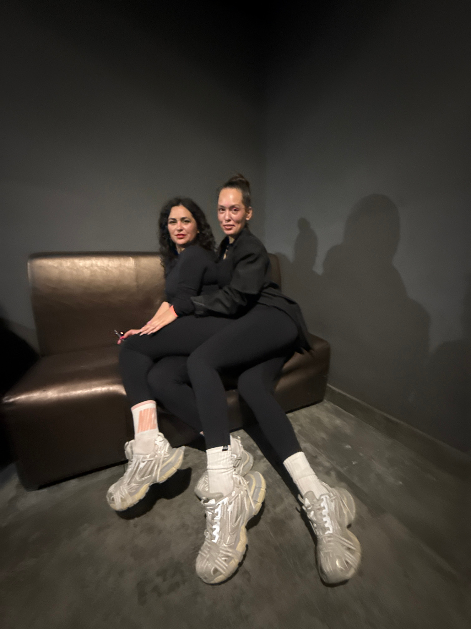 Two women are reclining on a brown leather couch in a room with dark gray walls. Both are wearing black leggings and black tops. The woman on top has her hair in a bun and is wearing white athletic sh…read more