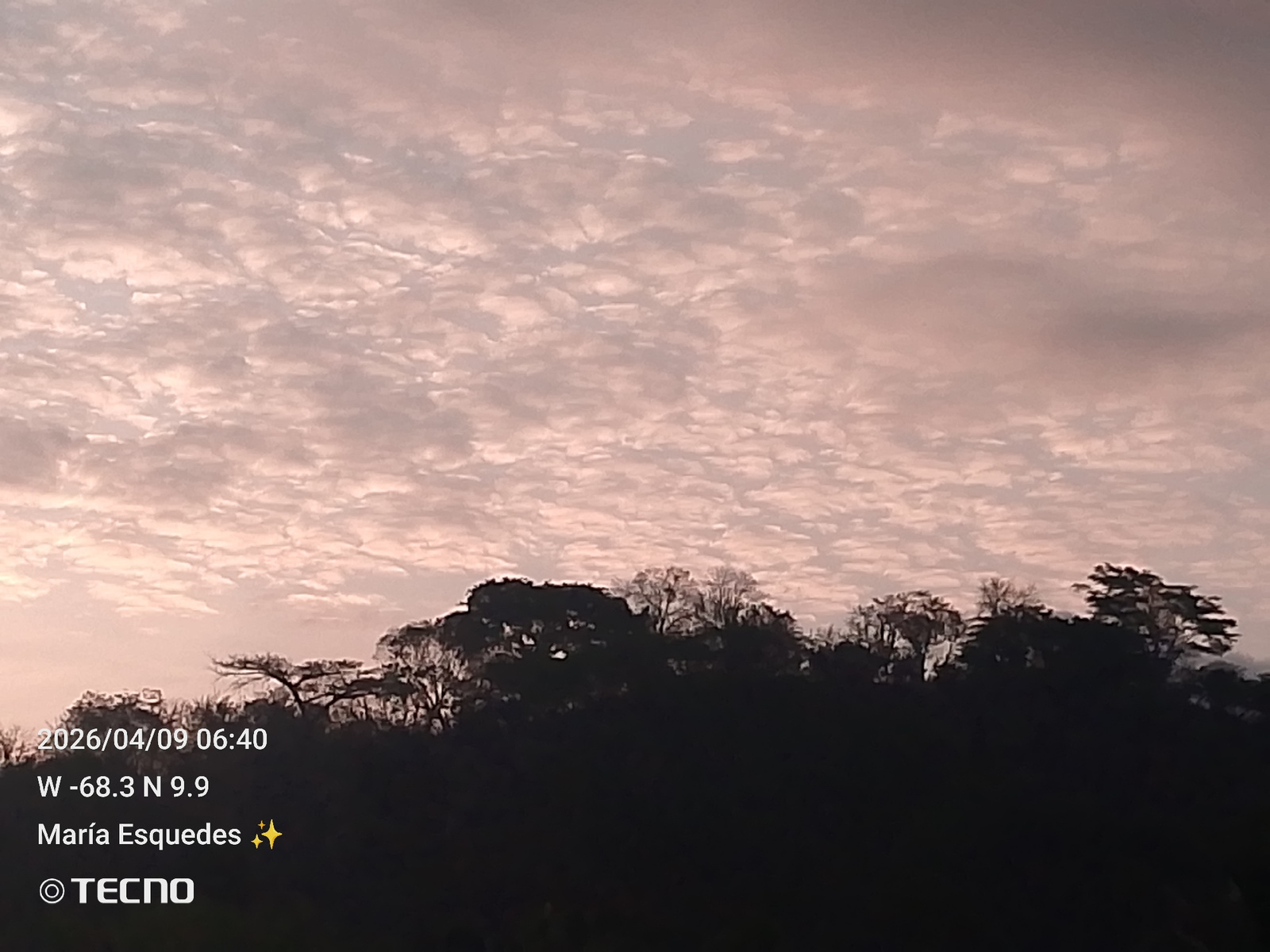 The image shows a landscape taken at dawn or dusk. The sky is filled with altocumulus clouds tinged with pink, suggesting the presence of sunlight despite the low angle. The lower portion of the image…read more