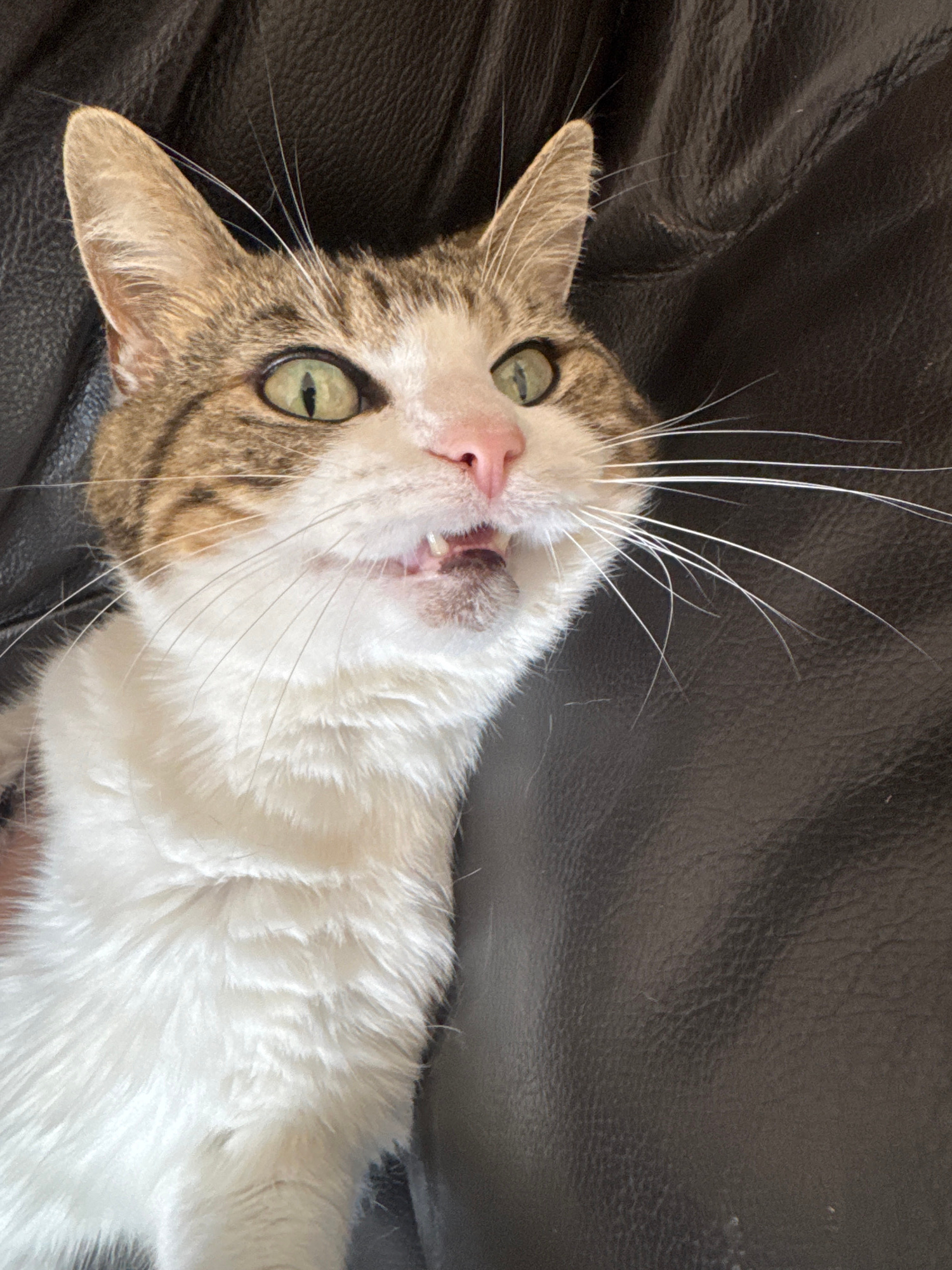 A close-up, slightly tilted, eye-level shot of a cat lying on a dark, textured surface. The cat is light brown and white, with prominent whiskers. It is showing some teeth. The background is a dark, t…read more