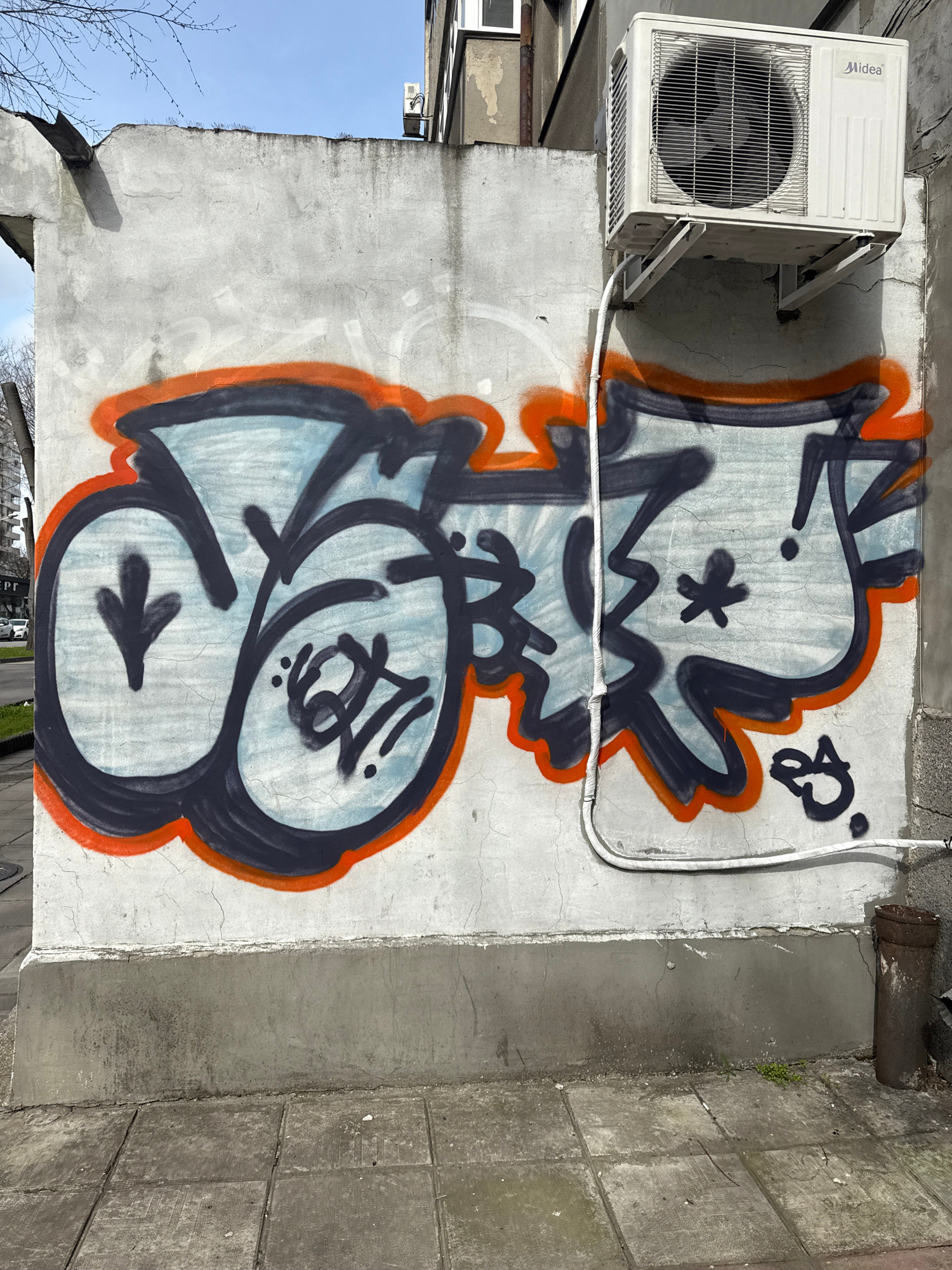 A vertical shot shows a section of a concrete building exterior with graffiti. The graffiti consists of an abstract cartoonish character outlined in orange and filled with light blue. The outlines of…read more