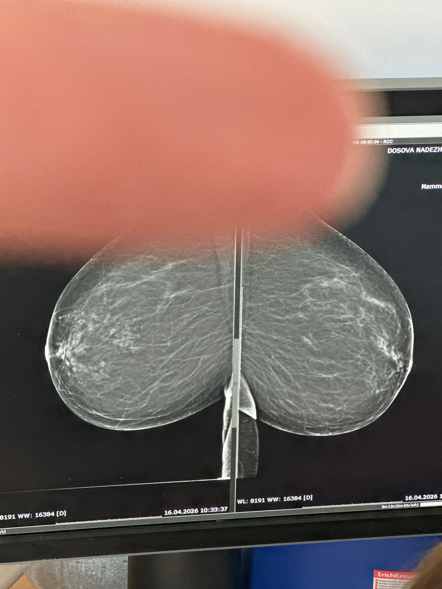 A digital screen displays two grayscale mammogram images, oriented vertically, showing breast tissue. The images are presented with a black background and white details, consistent with medical radiog…read more