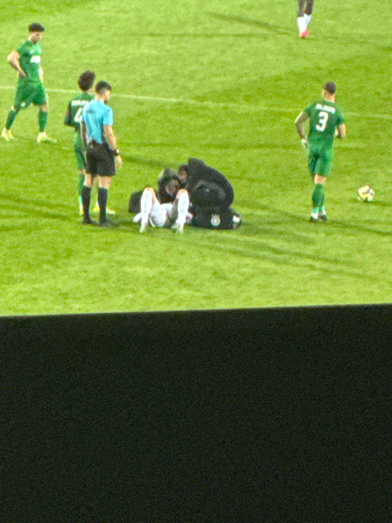 The image shows a soccer game taking place on a green field. In the upper left corner, a soccer ball is visible, with a player wearing a green uniform and the number 3 on his back standing nearby. Fur…read more