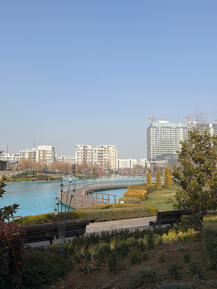 The image displays an urban park scene in Tashkent, Uzbekistan, under a clear, light blue sky. The foreground features dark earth with low green foliage, irrigation lines, and two dark wooden park ben…read more