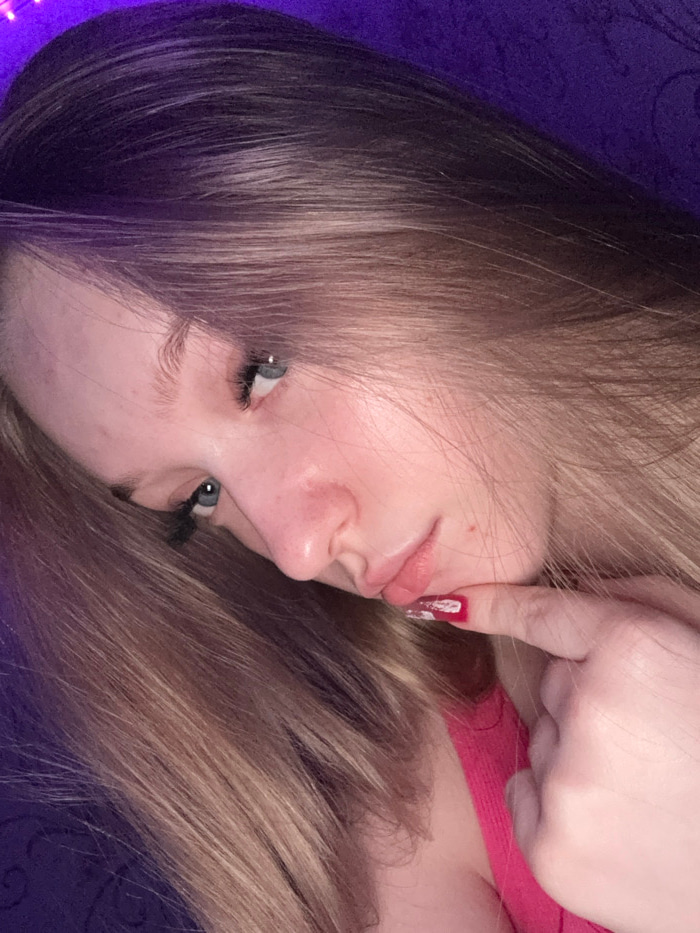 The image presents a close-up, diagonally oriented portrait of a female individual. Her head is tilted, with her gaze directed upwards and to the left. She has fair skin, blue-gray eyes, and long, lig…read more