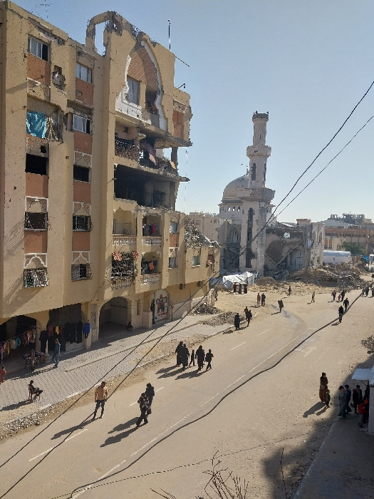 This image captures a street scene in Khan Yunis, Palestinian Territory, under a clear, bright sky. A multi-story building dominating the left side of the frame exhibits extensive structural damage, w…read more