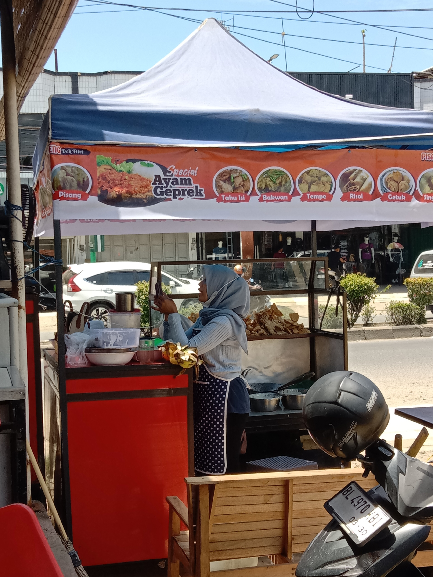 The image shows a street food vendor in Lhokseumawe, Indonesia, operating from a small, mobile stall under a white tent with a blue trim. The banner above the stall advertises "Special Ayam Geprek" al…read more