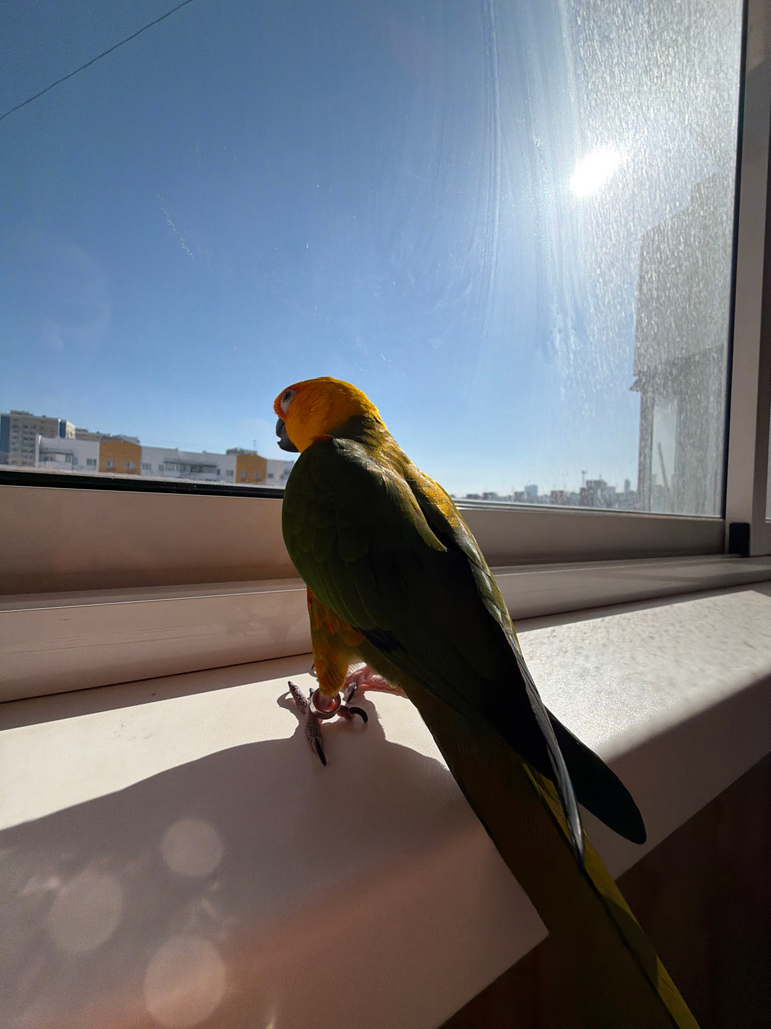 A green, yellow, and orange parrot is perched on a white windowsill inside a room. Outside the window, there is a view of a city with buildings under a bright, sunny, blue sky. Based on the urban land…read more