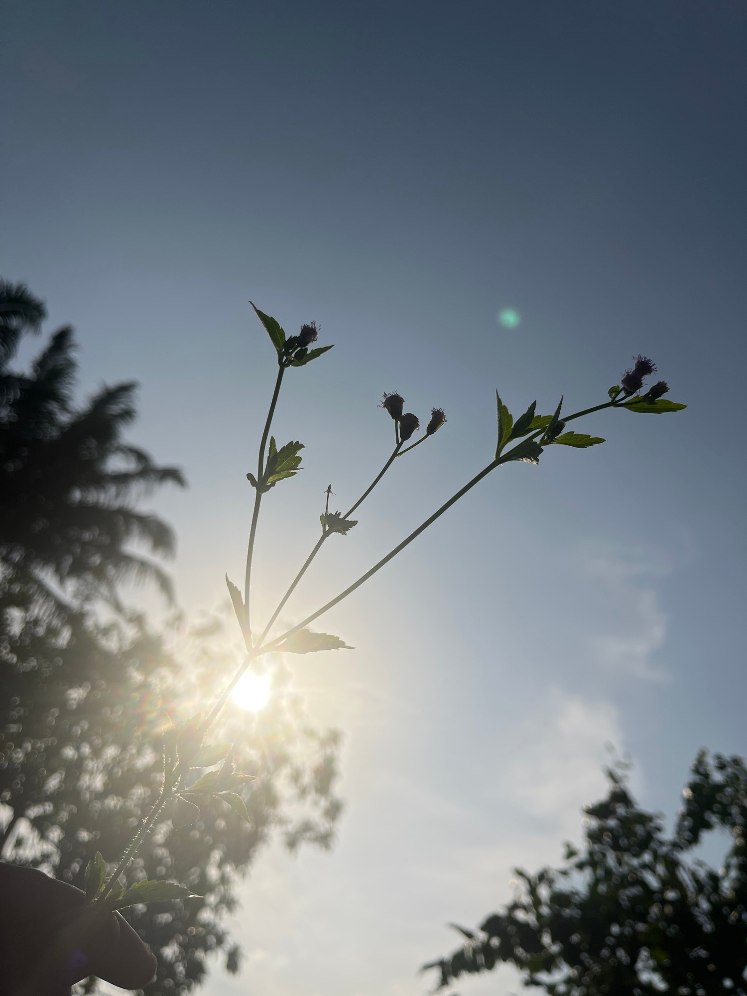 The image presents a low-angle, backlit shot of a slender plant stem held against a bright sky. The stem, featuring several small, serrated leaves and multiple closed or budding flowers with a subtle…read more