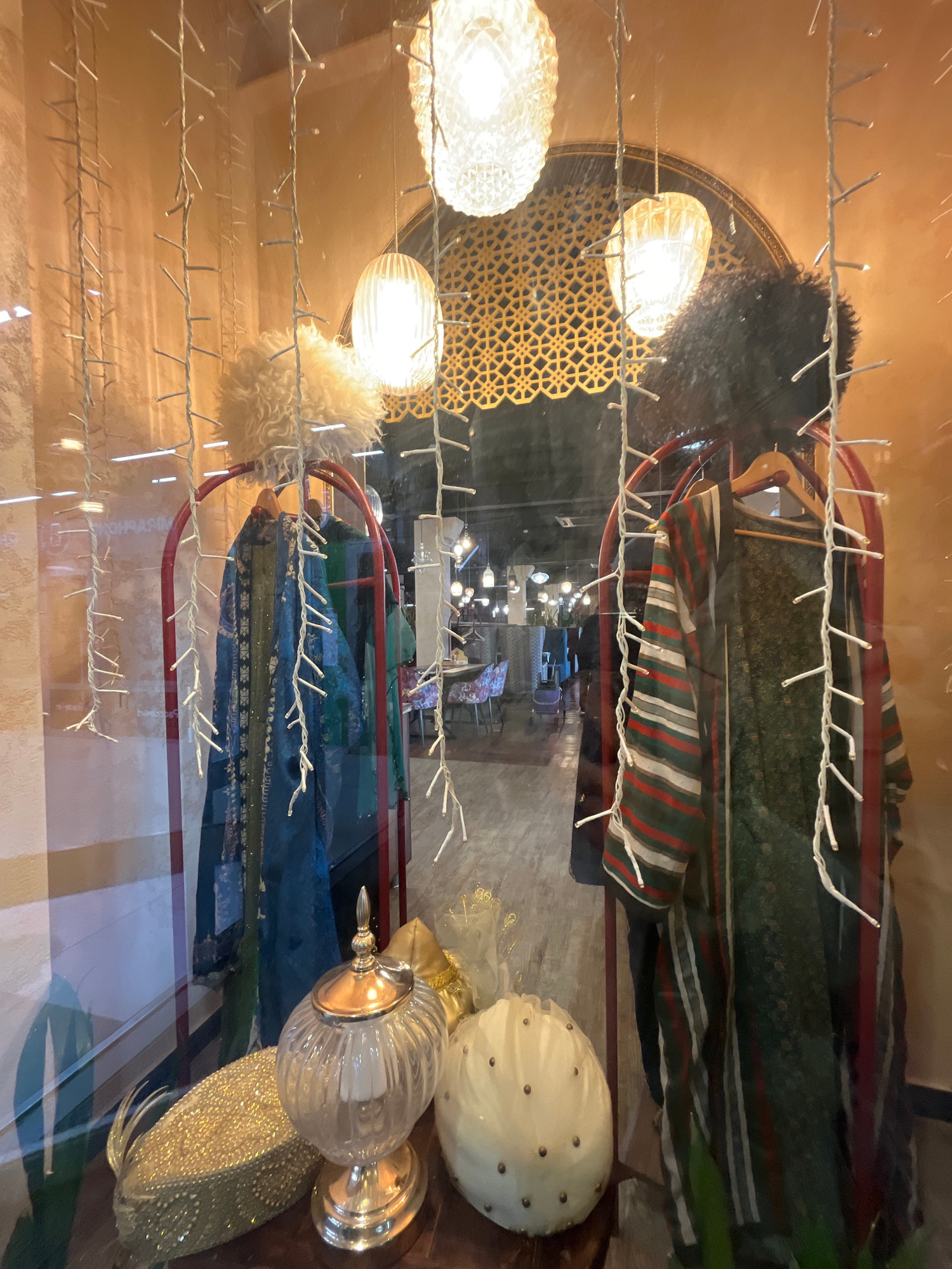 This image depicts a shop window display, photographed from the outside and rotated 90 degrees counter-clockwise. The scene is brightly lit, suggesting an evening or nighttime setting. A dense networ…read more