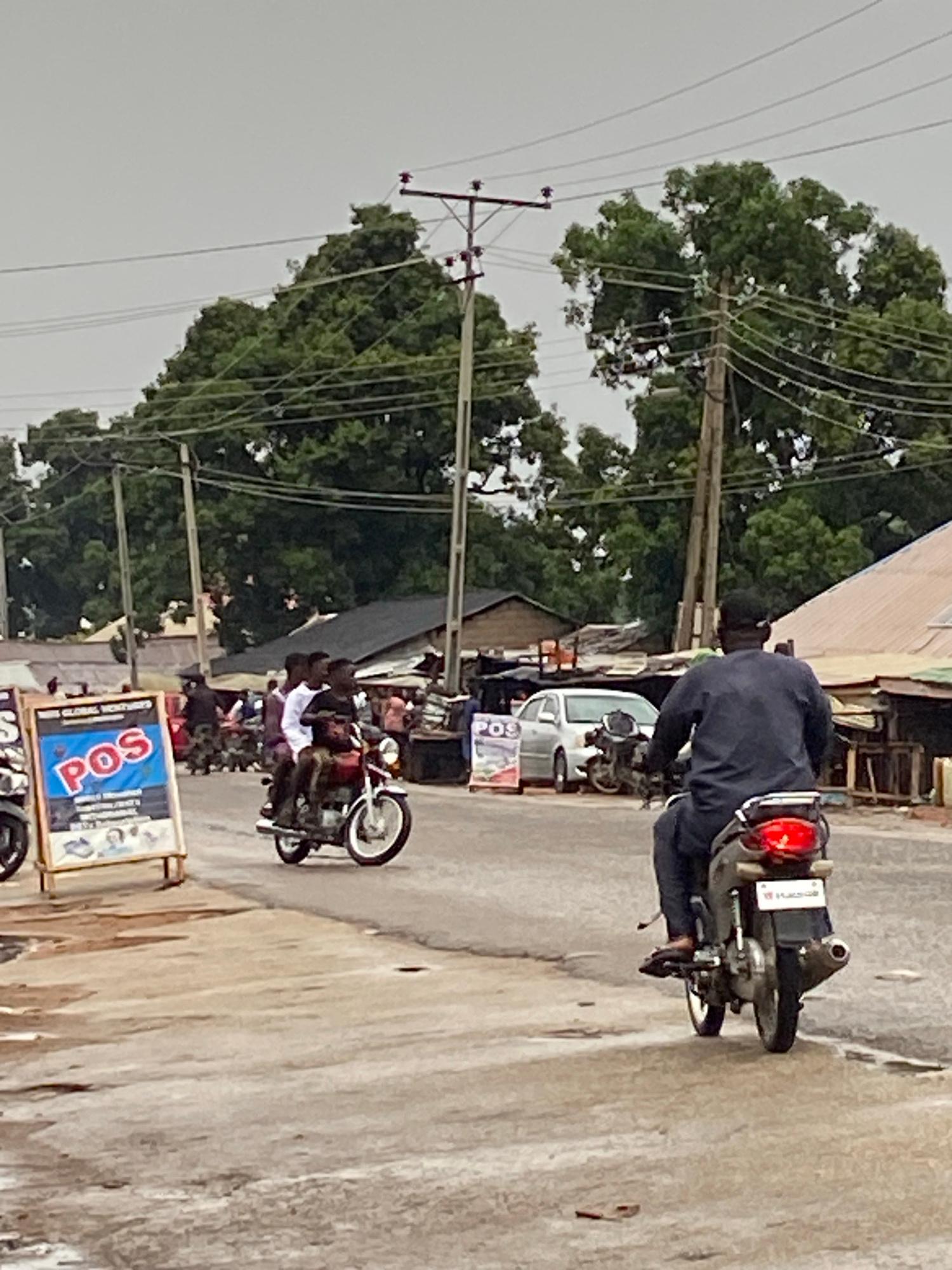 The image shows a street scene in Mararaba, Nigeria. Several people are riding motorcycles along the road. Power lines and poles line the left side of the street, alongside trees and buildings. A POS…read more