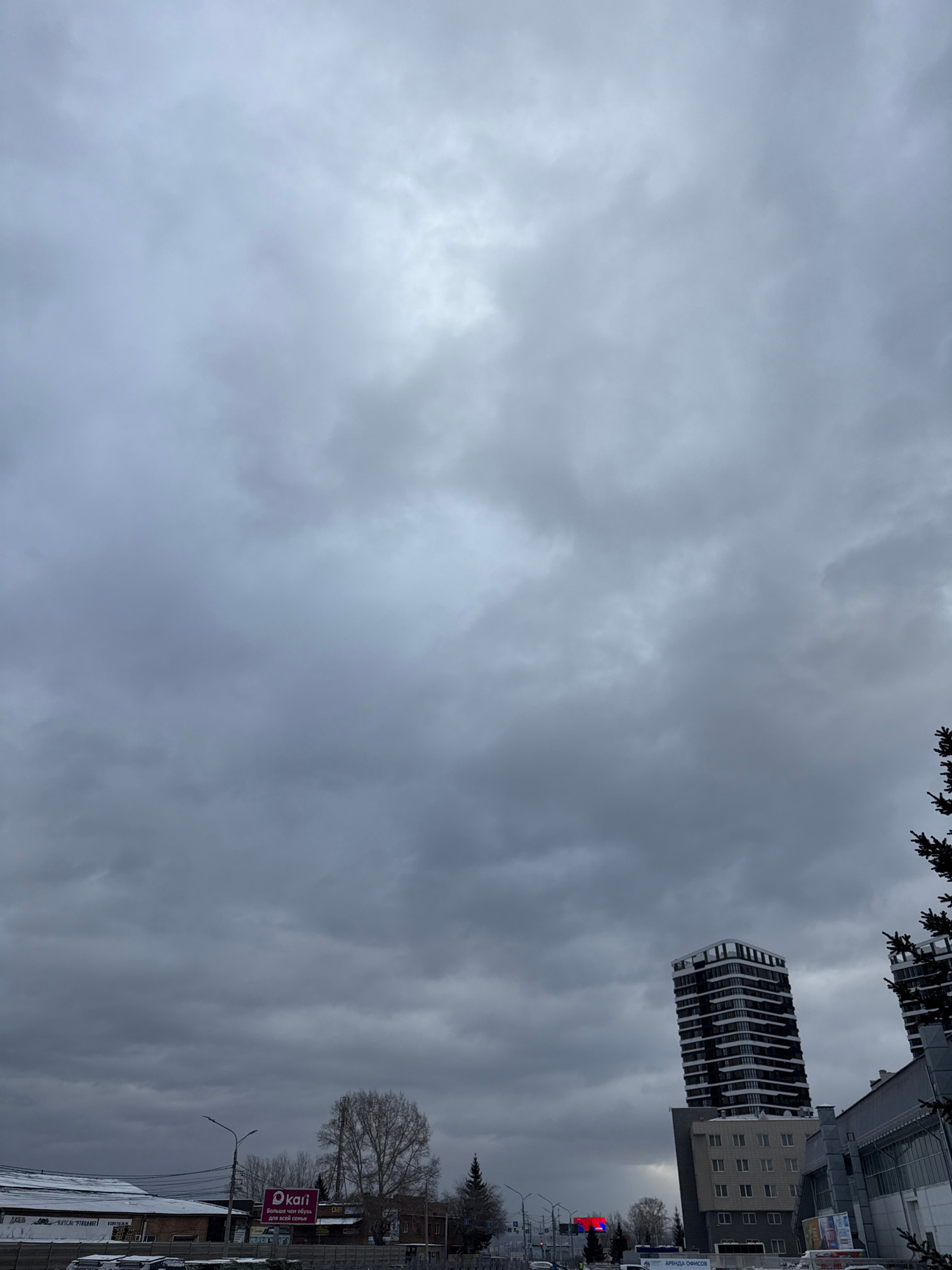 The image shows an overcast sky over what appears to be a street in Krasnoyarsk, Russia. A tall, modern building with a black and white facade is visible on the right side of the frame, suggesting an…read more
