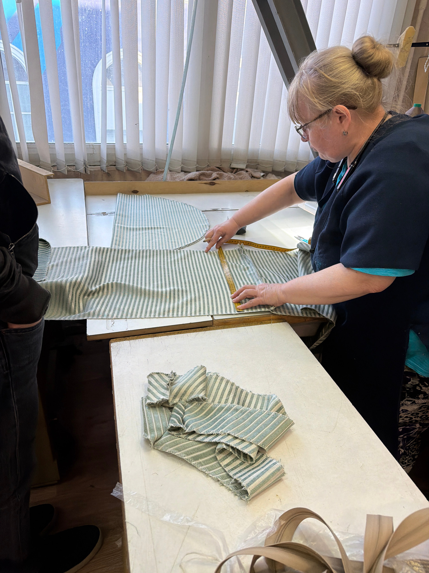 A person with light blonde hair pulled into a bun is standing over a white table, measuring a piece of striped fabric with a yellow measuring tape. The fabric appears to be partially cut into a curved…read more