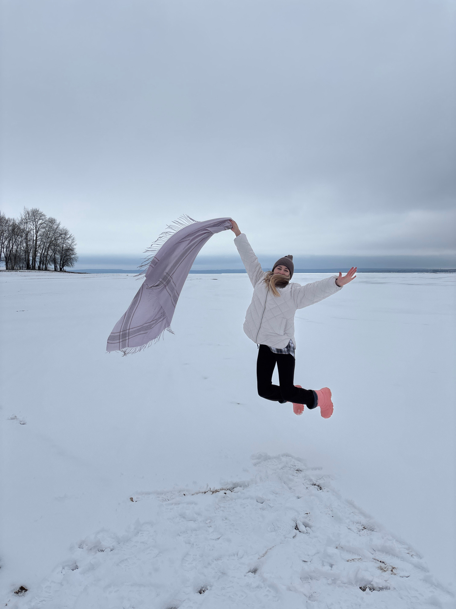 A person stands in a snow-covered landscape, holding a gray, fringed scarf in their left hand. They wear a white quilted jacket, black pants, a brown beanie, and pink boots. Their arms are outstretche…read more